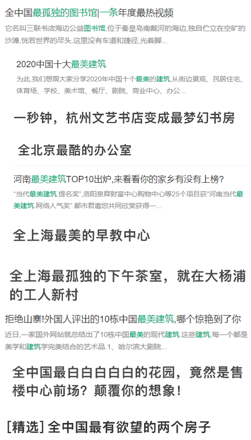 在丑陋的对立面,出于营销的考虑,媒体们开始大肆使用“最XX的建筑”为题,来推销建筑形象。这类文章标题的起点和高潮都是2015年一条的那篇【全中国最孤独的图书馆】,之后迅速风靡,成为一种建筑形象营销的常用方式。