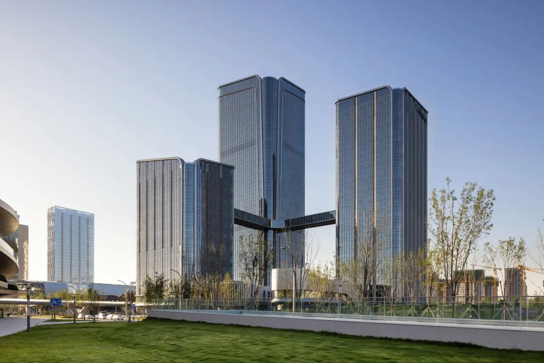 由三益主持设计的招商蛇口西安丝路中心项目,是本次第十四届全运会重点配套项目之一。项目由南北两个地块组成,分别位于奥体中轴公园“长安谷”主轴的南北两翼,建筑沿中轴对称布局,作为“奥体之翼、中轴之门”,与奥体中轴生态公园相辅相成,隔景观带对称分布的两座三体式建筑群落形成环抱奥体的空间形态,既体现了开门迎客的寓意,又塑造了西安城市门户形象的效果。