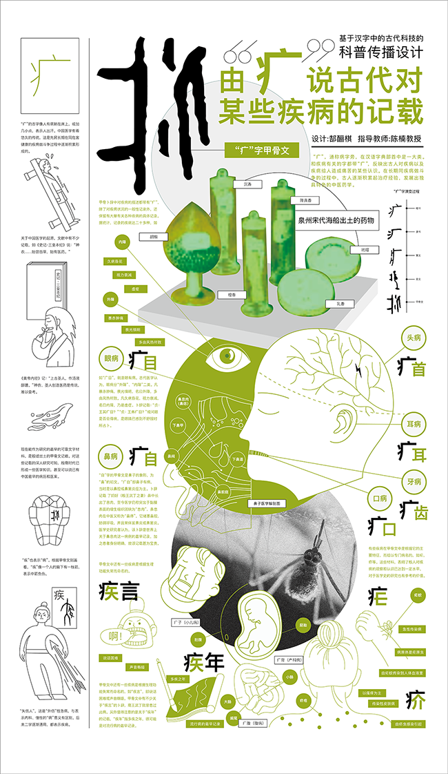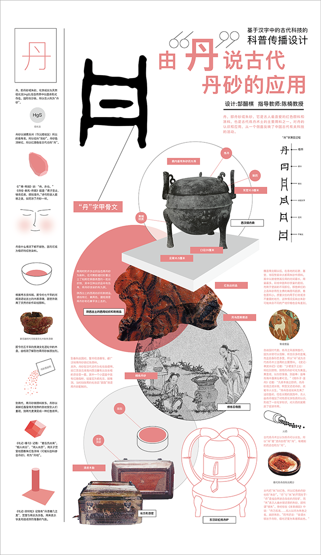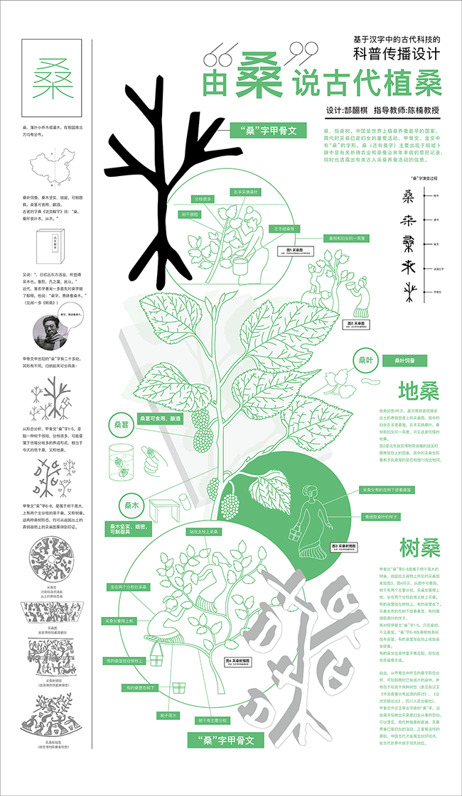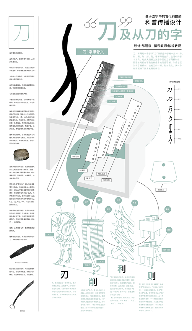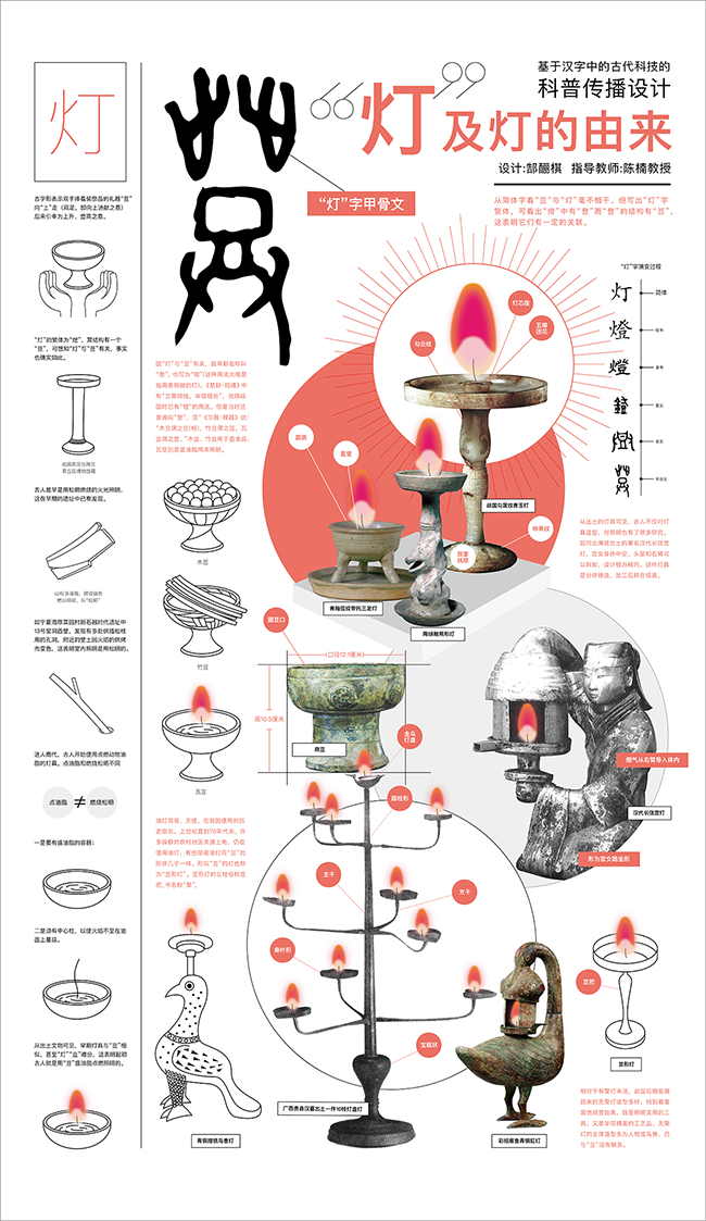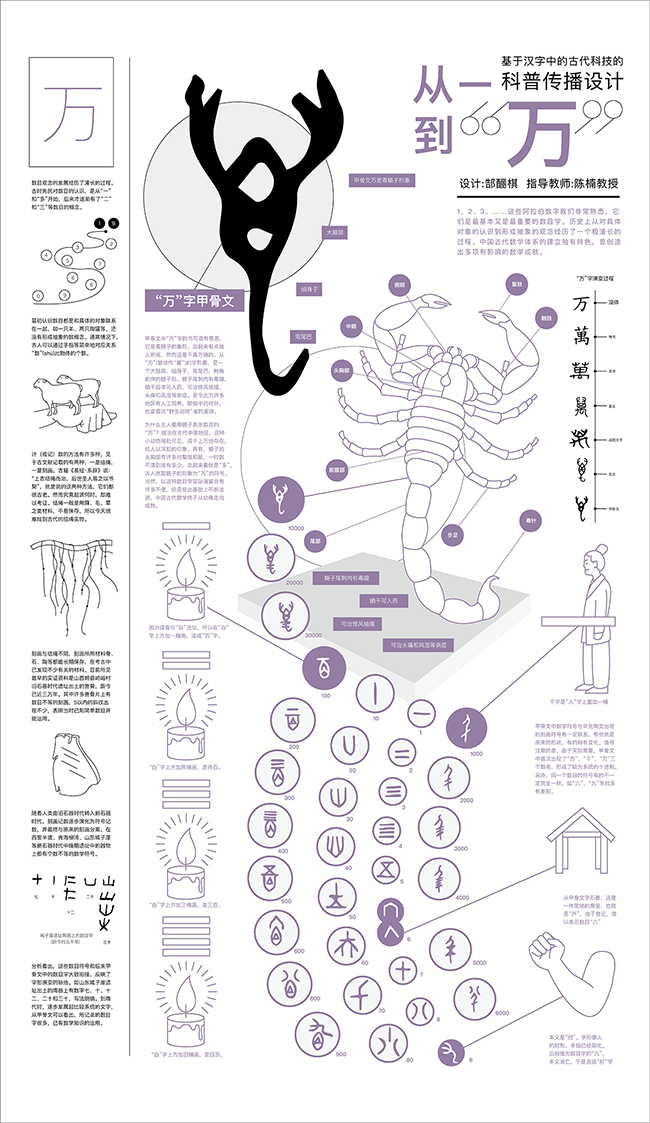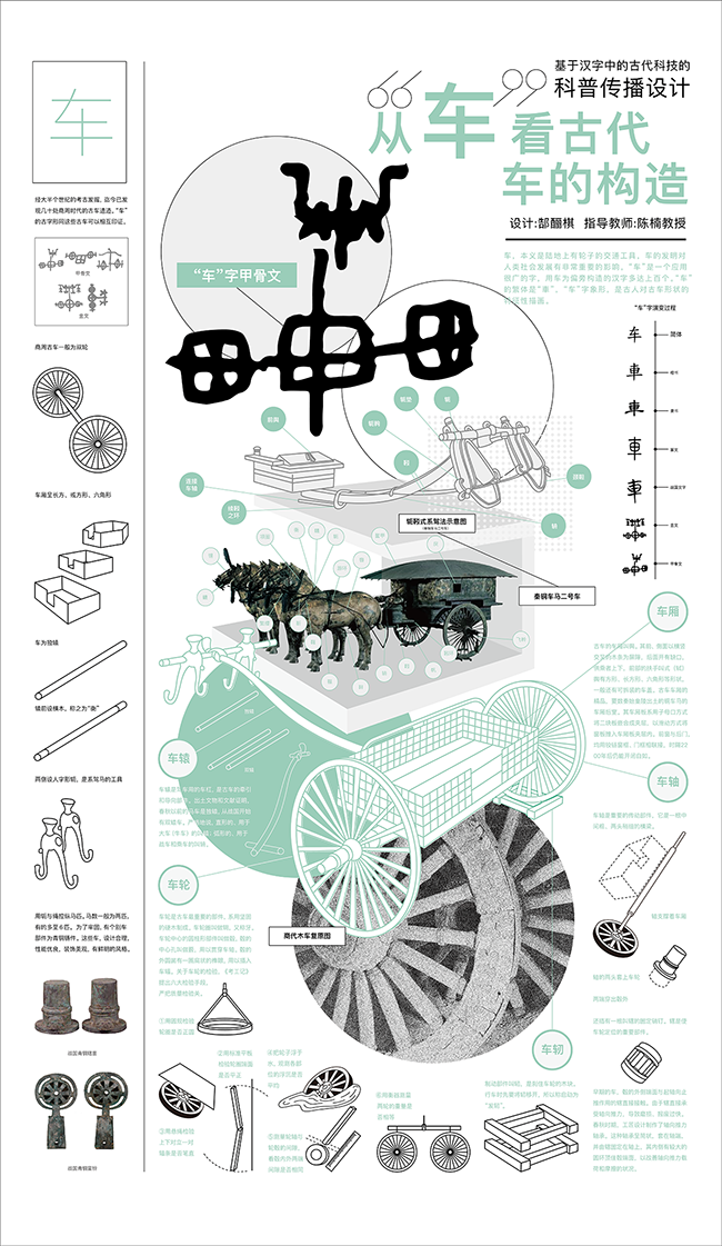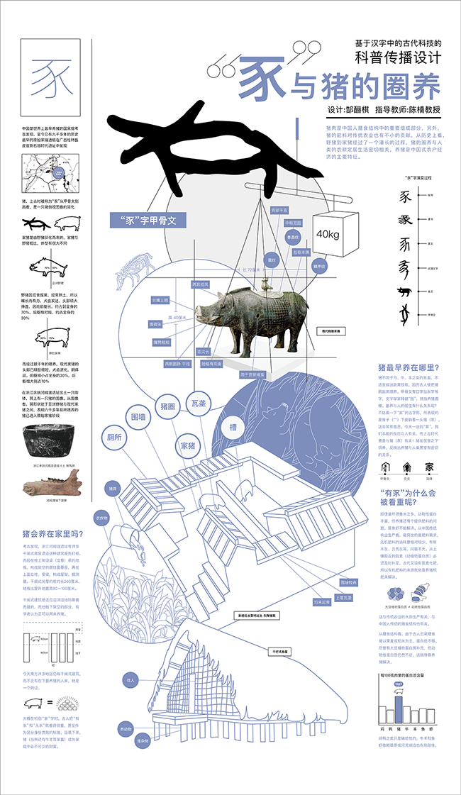 以《汉字中的古代科技》一书为参考文本进行科普传播设计,从中选择十二个篇章来讲述汉字,分别是“耒”及从“耒”的字,“豕”与猪的圈养,由“桑”说古代植桑,“灯”的由来,“刀”及从“刀”的字,从“车”看古代车的构造,“瓦”字出现与瓦当制作,“纸”字出现与造纸革新,从“一”到“万”,由“丹”说古代丹砂的应用,由“疒”说古代对某些疾病的记载,“虹”从观察到解释。这十二个章节分别对应了古代农耕技术,畜牧技术,纺织技术,手工制造技术,铸造技术,交通工具制造技术,建筑技术,造纸技术,数学科学,化学,医疗与天文学。以十二组信息可视化的设计形式为主体,搭配绘本与文创衍生品等设计手段,通过极简风格的科普设计形式对汉字中的古代科技进行传播设计,让受众能够更好的了解汉字中的古代科技。