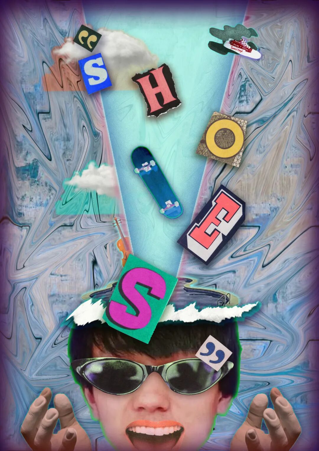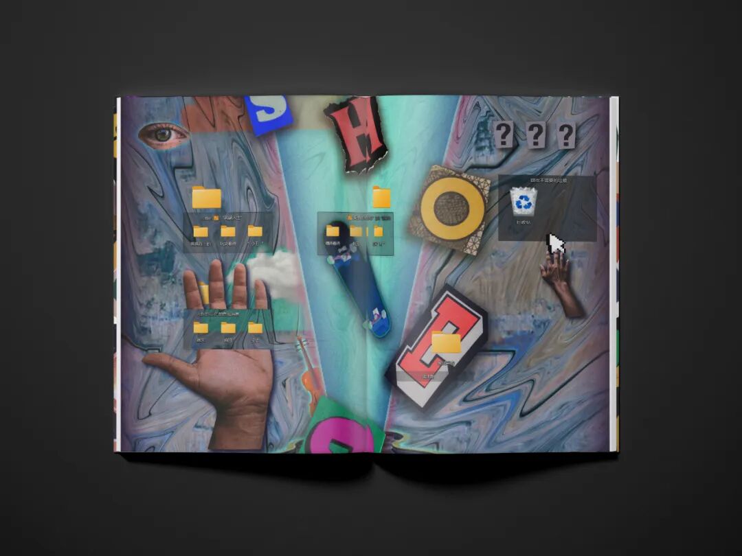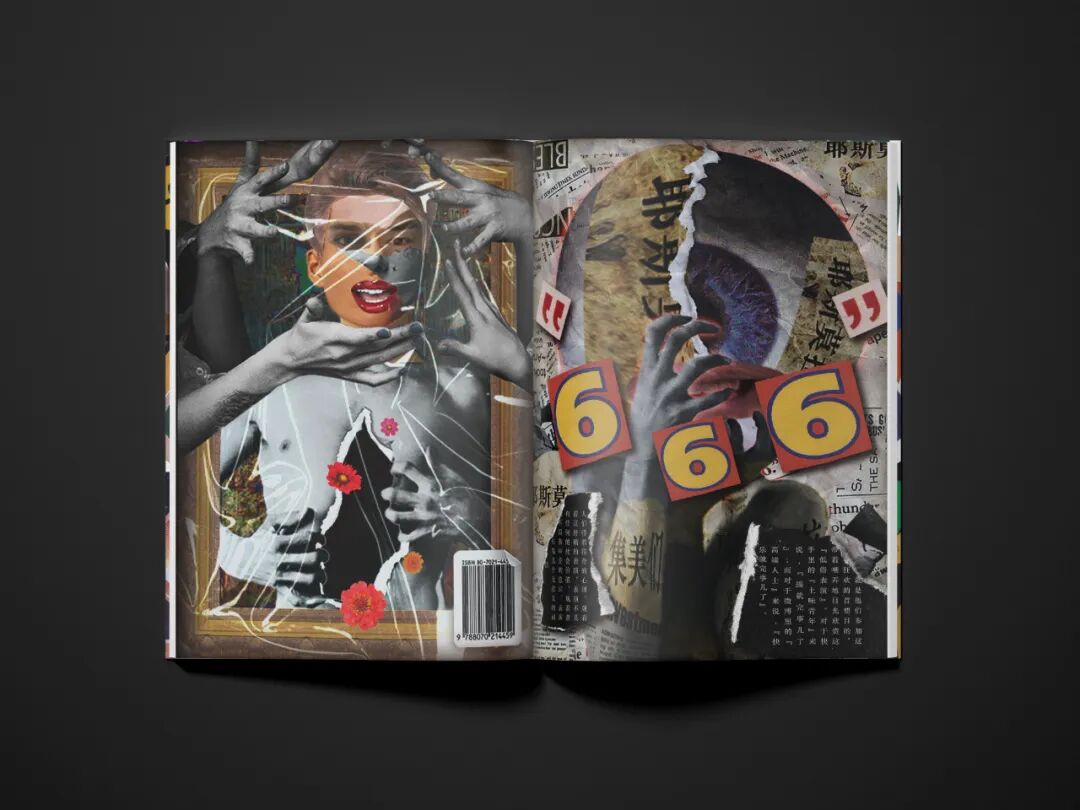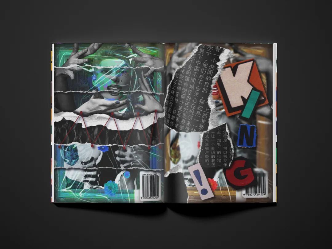 海报运用数字拼贴和解构的表现形式,将多个或者视觉上毫不相关的元素通过蒙太奇手法组合在一起,去除原本事物的完整性,赋予其新的特点。海报主要以《迷幻》、《空虚、《盲目》、《控制》和《疯狂》这5个主题进行创作,借土味传播者形象表现土味受众沉溺在土味文化中不同的状态。所有的海报都有一个共同特点:人物都在凝视着我们。海报边缘都做了深色延展处理,这些深色延展就像是电视、电脑的屏幕。大众通过屏幕凝视对方,对方也通过屏幕凝视着我们。