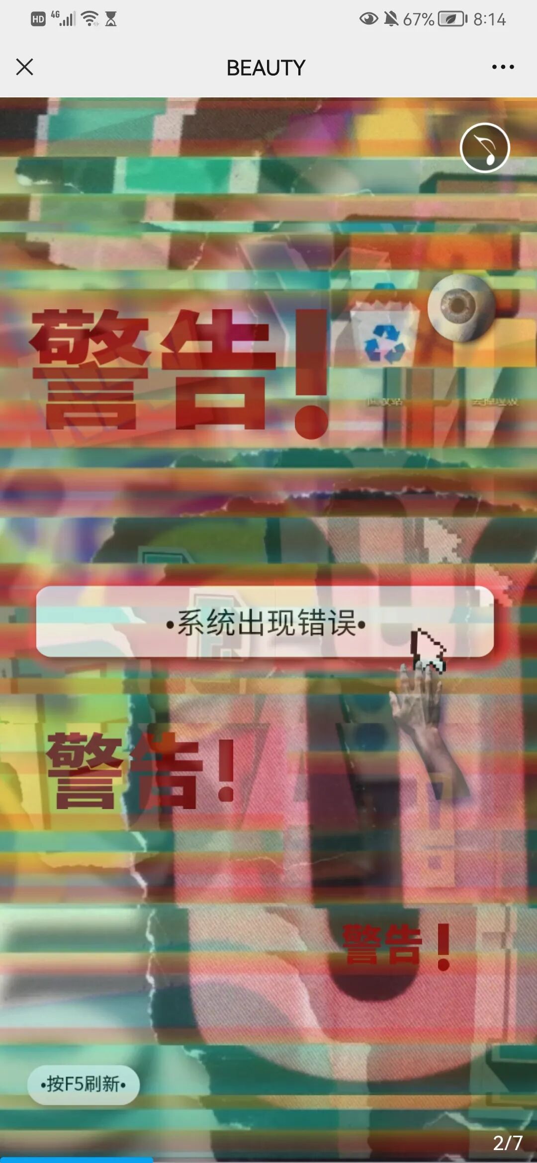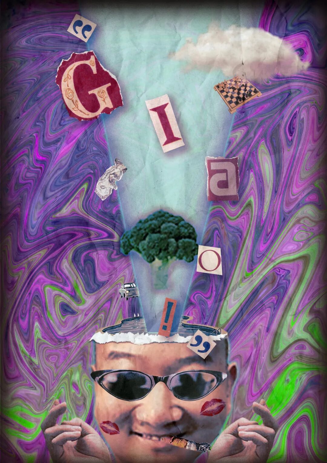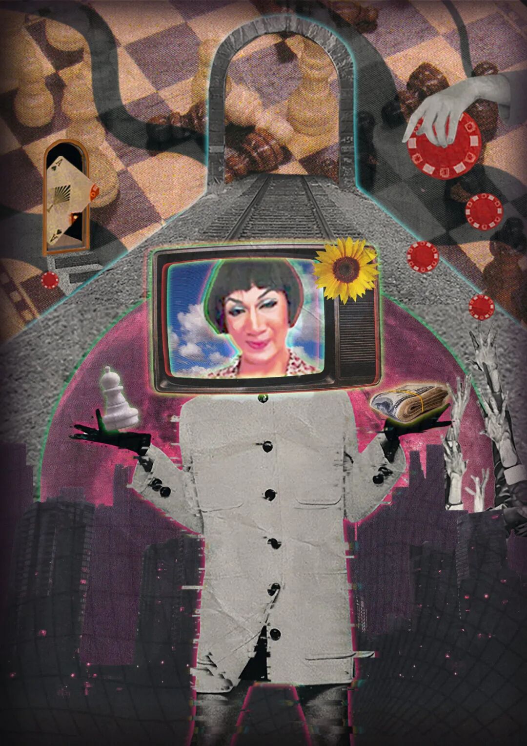 海报运用数字拼贴和解构的表现形式,将多个或者视觉上毫不相关的元素通过蒙太奇手法组合在一起,去除原本事物的完整性,赋予其新的特点。海报主要以《迷幻》、《空虚、《盲目》、《控制》和《疯狂》这5个主题进行创作,借土味传播者形象表现土味受众沉溺在土味文化中不同的状态。所有的海报都有一个共同特点:人物都在凝视着我们。海报边缘都做了深色延展处理,这些深色延展就像是电视、电脑的屏幕。大众通过屏幕凝视对方,对方也通过屏幕凝视着我们。