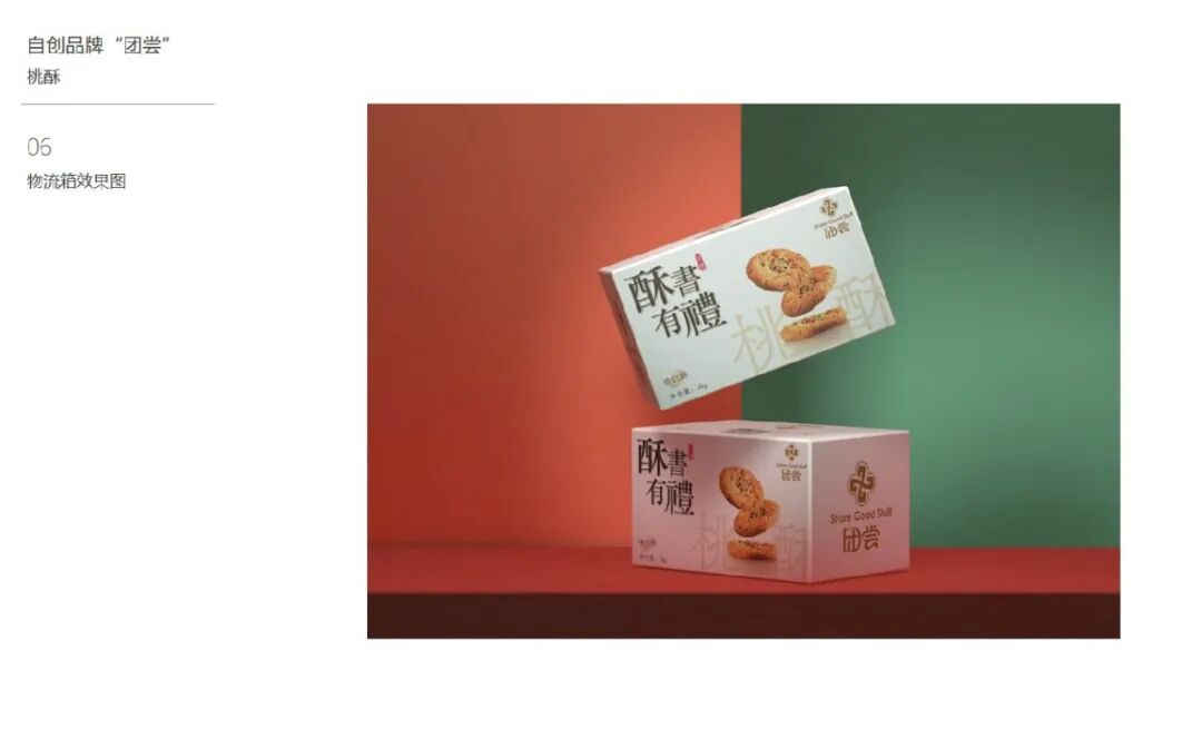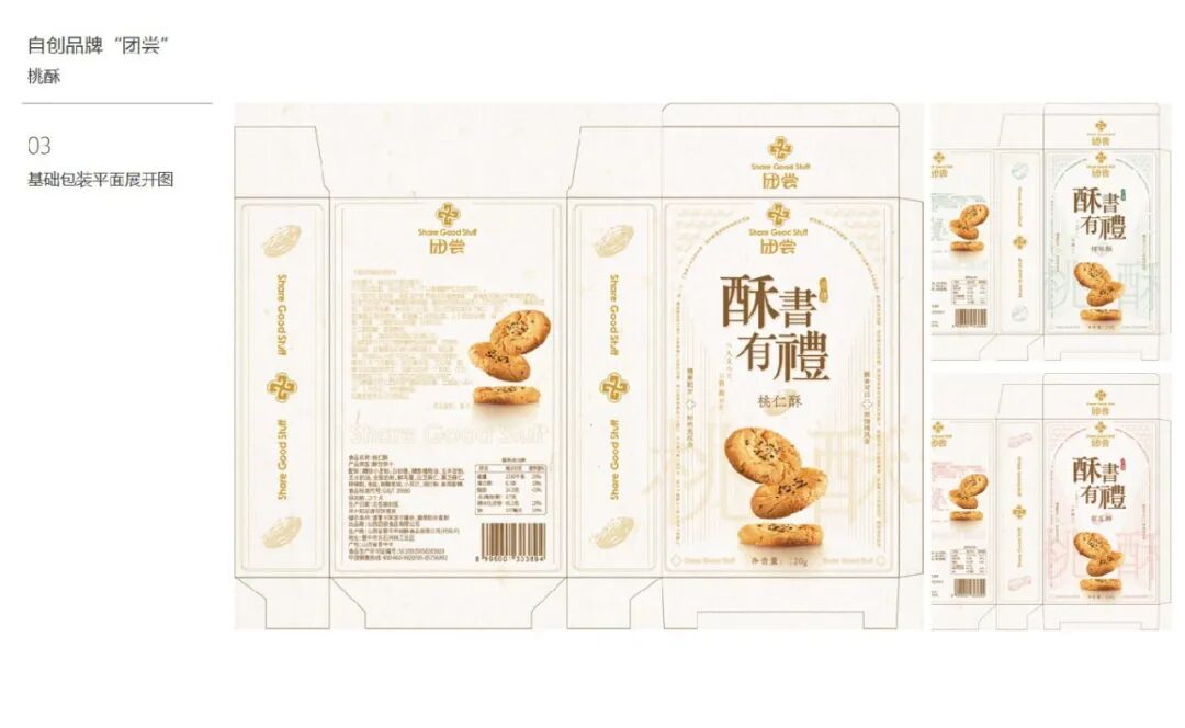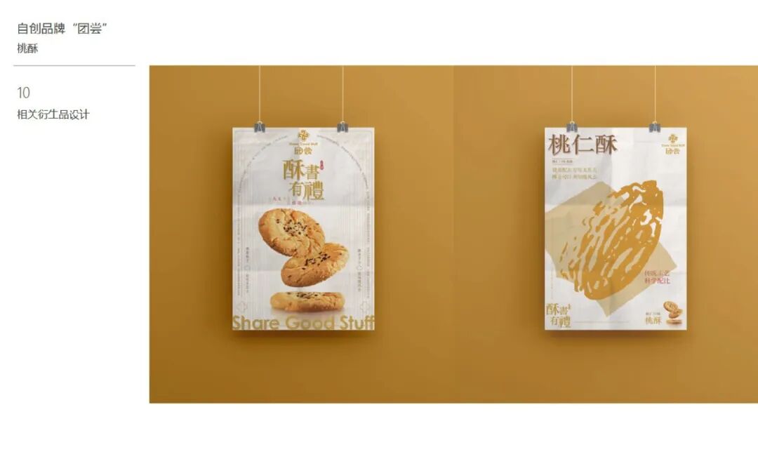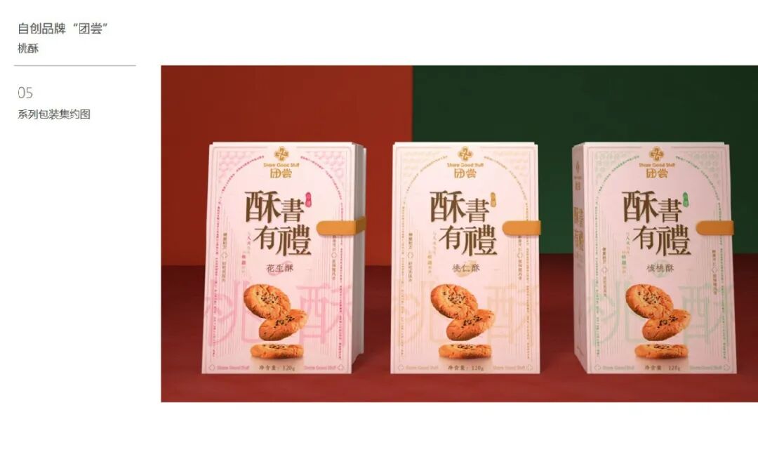 “团尝”是一个主要做中式糕点的品牌,产品是桃酥。团尝的品牌理念是传承、连结和分享,关注华夏传统历史人文信息,并力求将这样的信息传达到我们如今的生活中。在品牌全案设计中,着重提取“景德镇出身的酥书”这一主要故事信息,将桃酥的产品系列主题定为“酥書有禮”,包装系列包括模拟书本形式的礼盒装,更直观的传达“分享”的品牌理念。包装上通过“酥书写给朋友的一封信”来讲述产品故事,传达人文情怀。