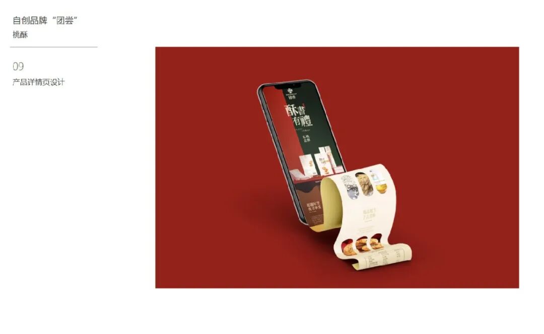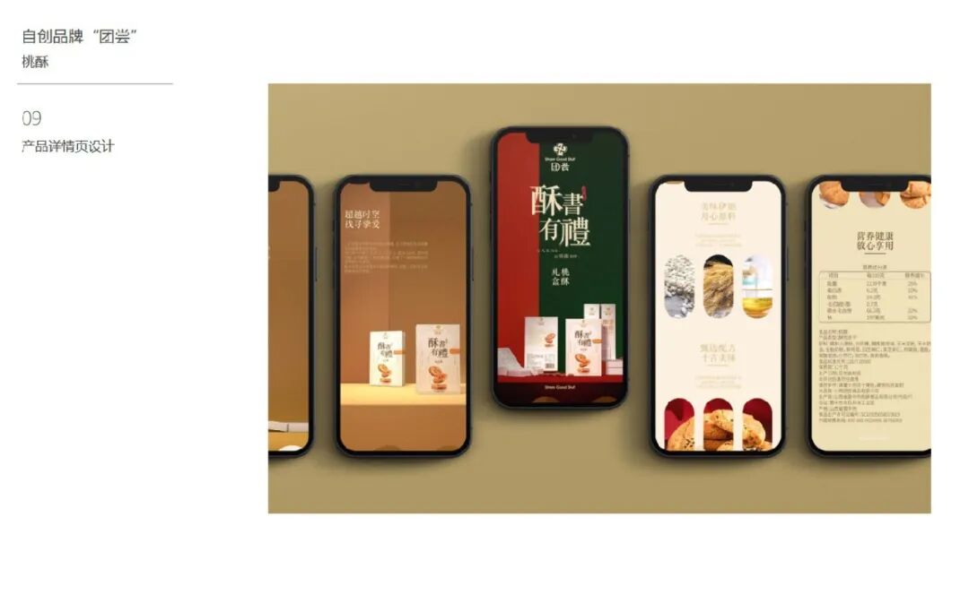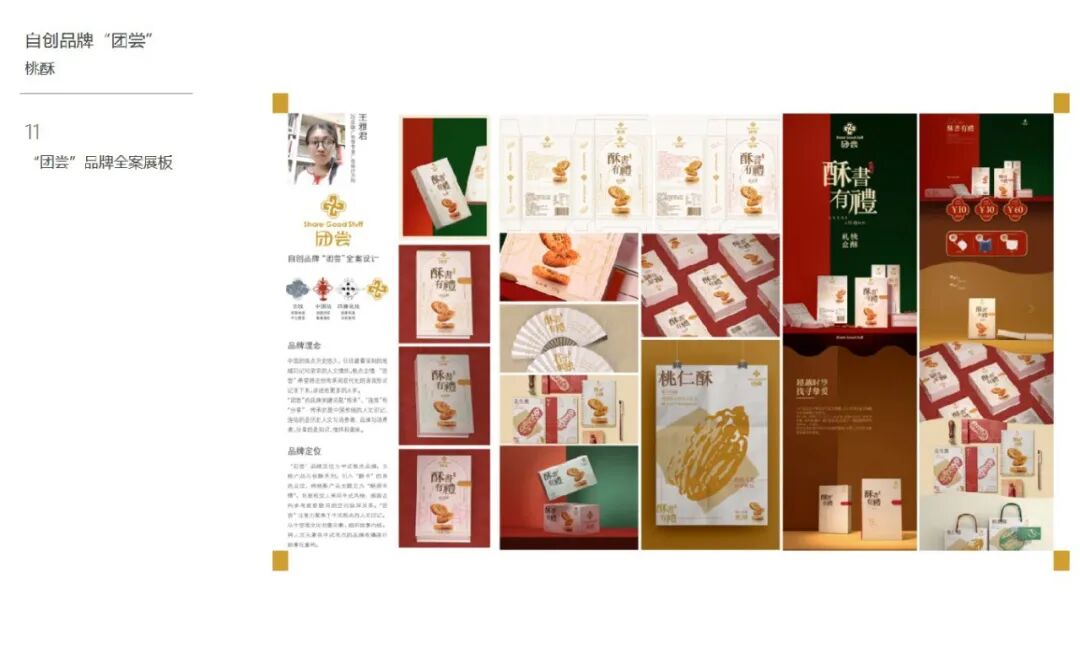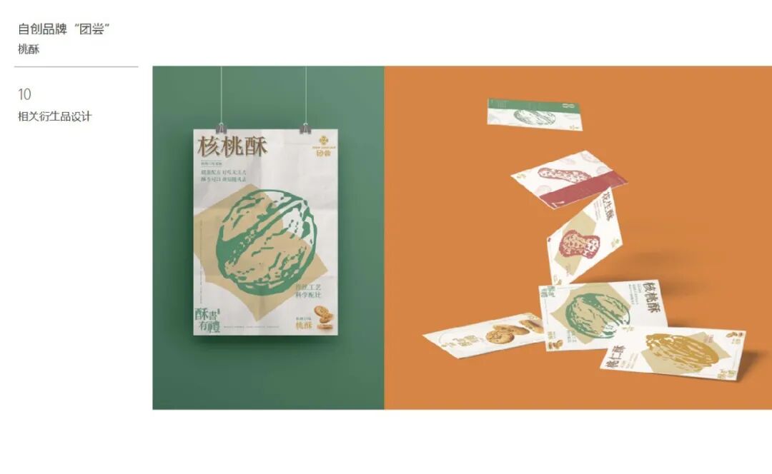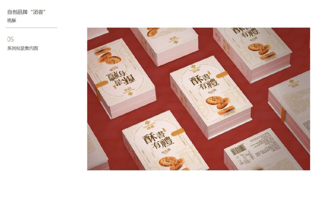 “团尝”是一个主要做中式糕点的品牌,产品是桃酥。团尝的品牌理念是传承、连结和分享,关注华夏传统历史人文信息,并力求将这样的信息传达到我们如今的生活中。在品牌全案设计中,着重提取“景德镇出身的酥书”这一主要故事信息,将桃酥的产品系列主题定为“酥書有禮”,包装系列包括模拟书本形式的礼盒装,更直观的传达“分享”的品牌理念。包装上通过“酥书写给朋友的一封信”来讲述产品故事,传达人文情怀。