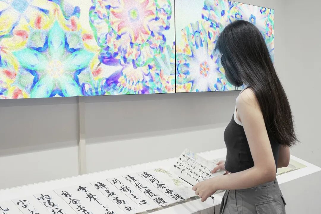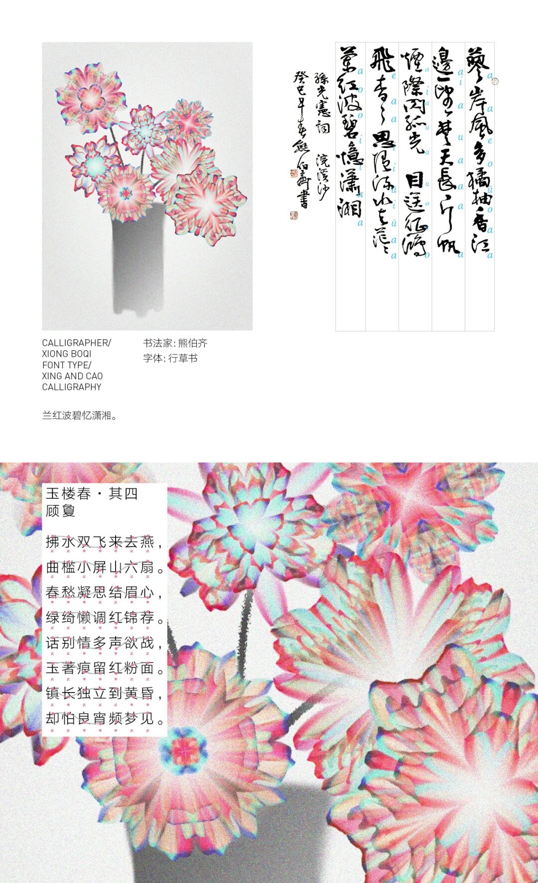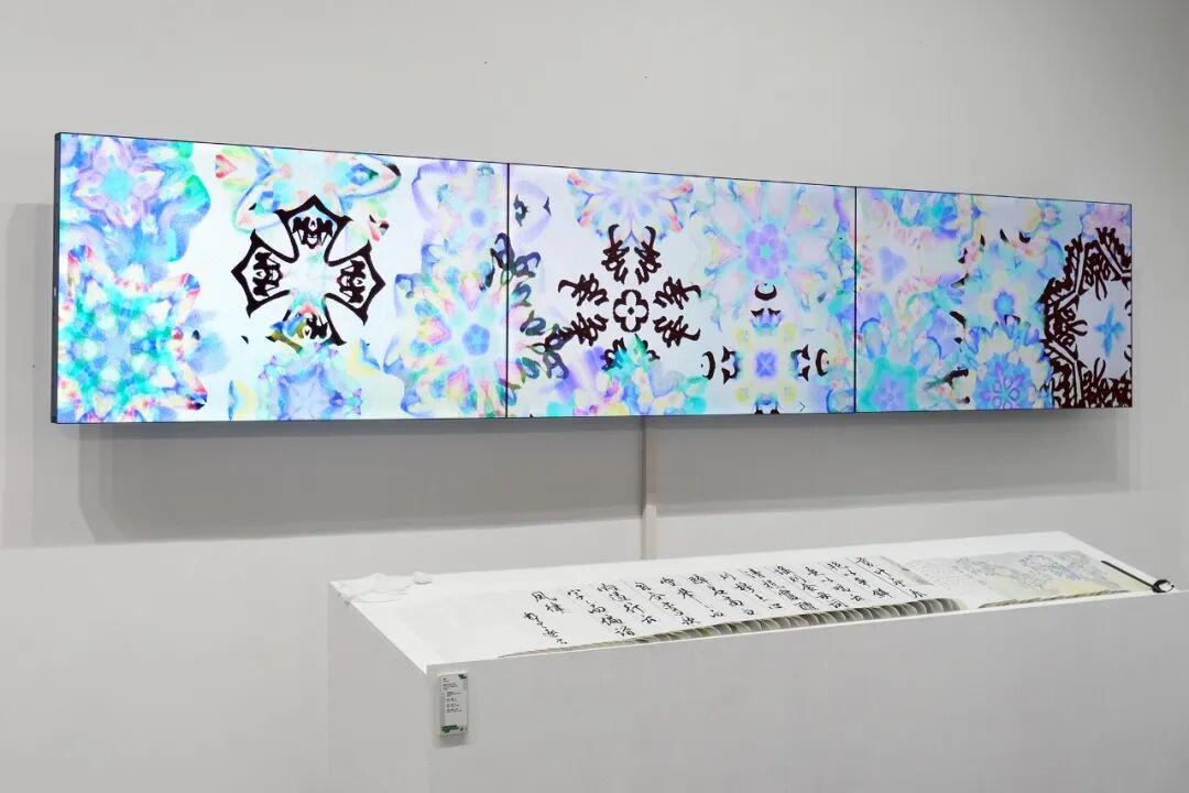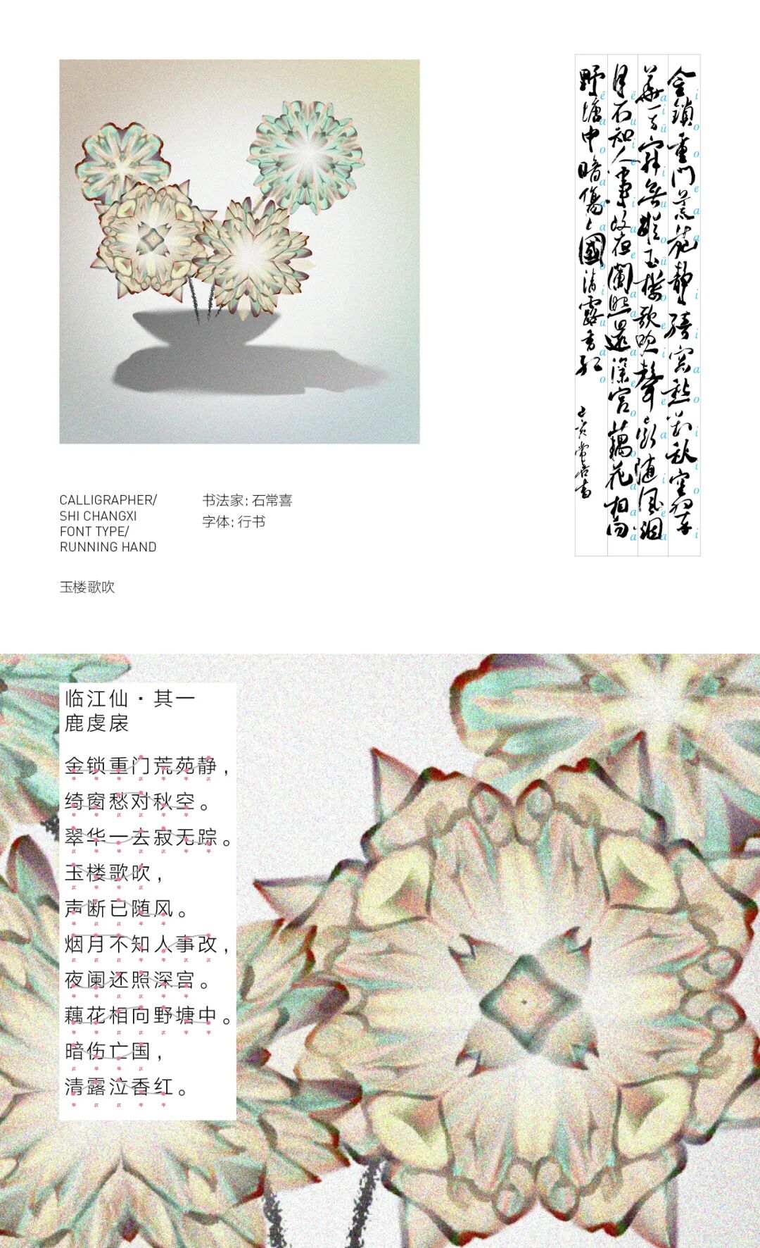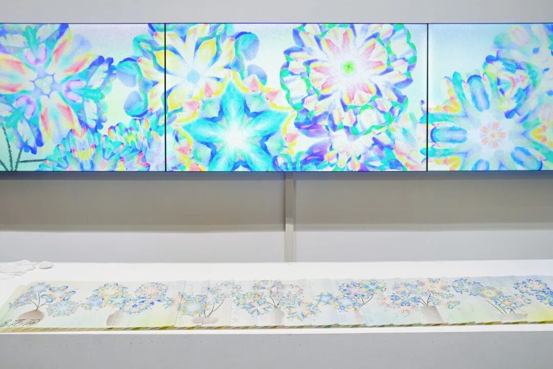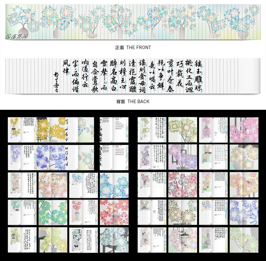 我亲历了北京2022年冬奥会开幕式的仪式前表演《一起向未来》的全程设计与制作,主要负责“福立方”的环节,运用了中国传统剪纸元素与万花筒进行结合,根据万花筒成像原理以编程形式构建了一个参数化的设计模型。这一实践经历给我很大的收获与启发,由此延用了万花筒的设计模型,并结合中国传统诗词格律创作出《字里花间》。作品名意为“字成一花,花间有字”,灵感来源自“梦笔生花”,即文人笔下所至开出一片片花朵,表示文笔出色。我在中国最早的文人词集《花间集》中节选十八首词,搜集整理这些词的书法作品,而后将逐个字转化成花,并且运用了诗词格律和万花筒成像原理,每一朵花的结构都取决于文字的字形,将诗词的韵律感融于其中。我希望以一种浪漫的方式展现中华诗词之美,从而探索如何借助科技的力量赋能艺术,讲述中国故事。视觉呈现方式是动态影像和龙鳞装书籍。