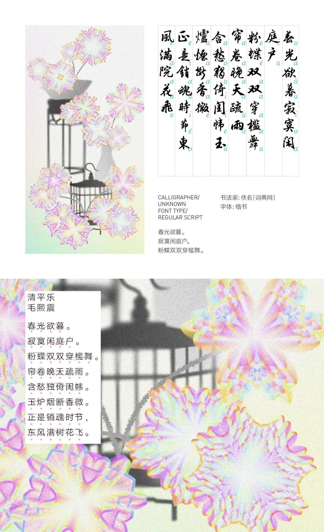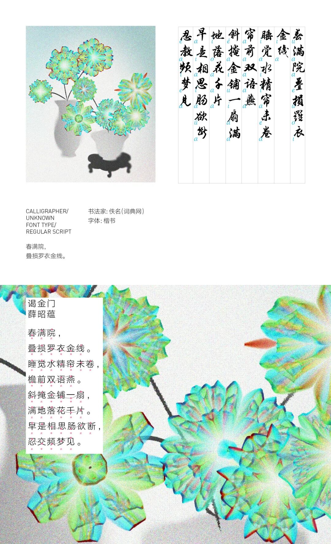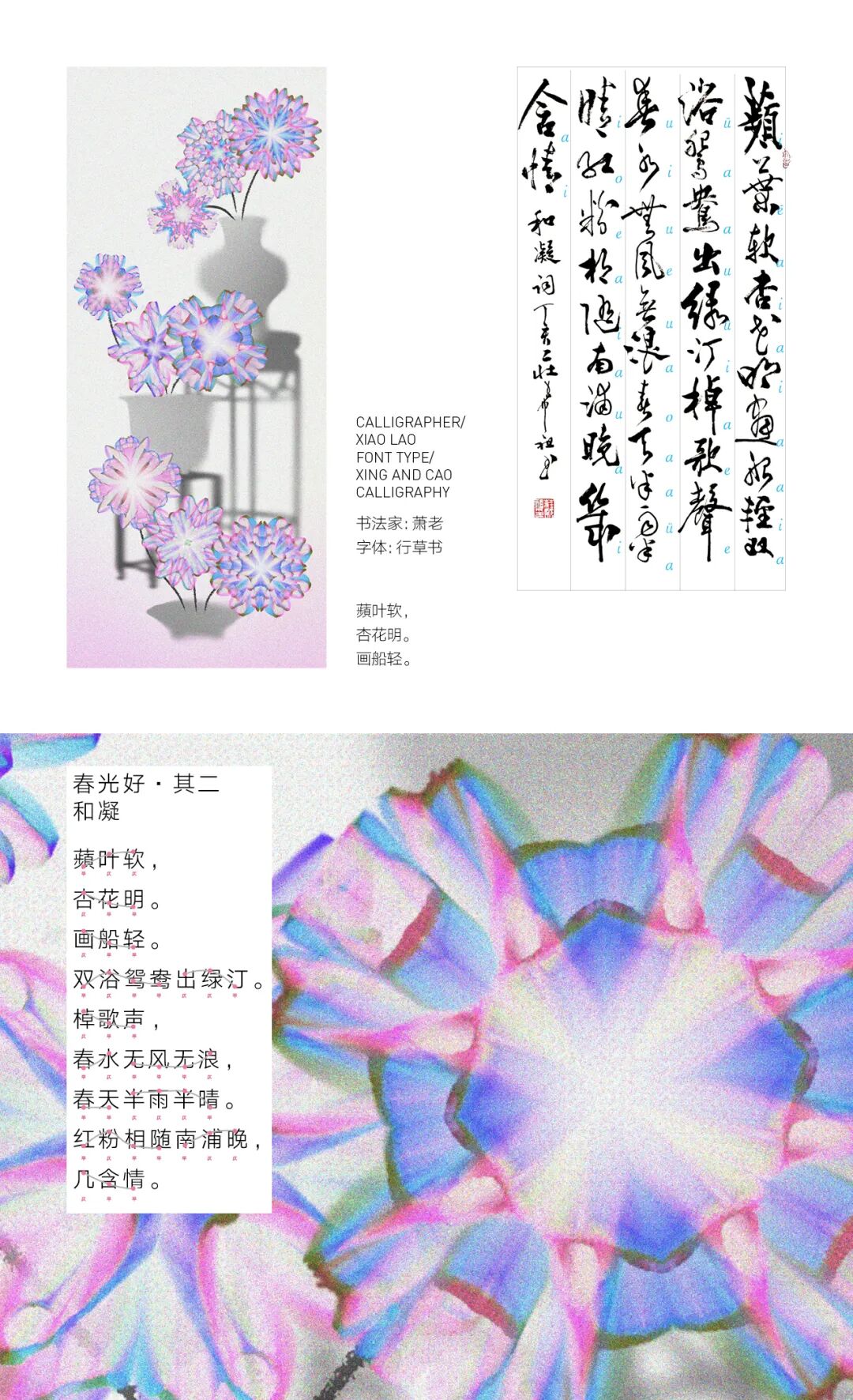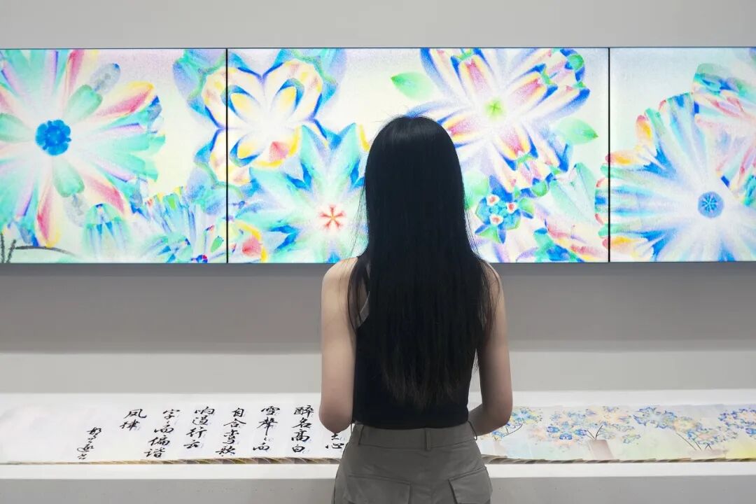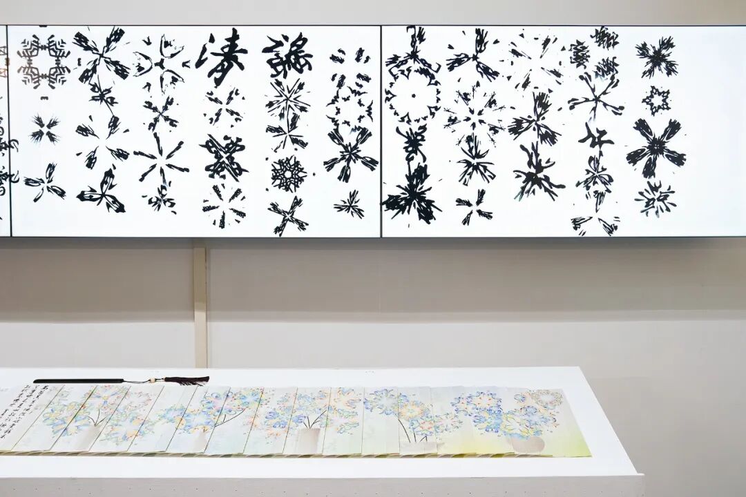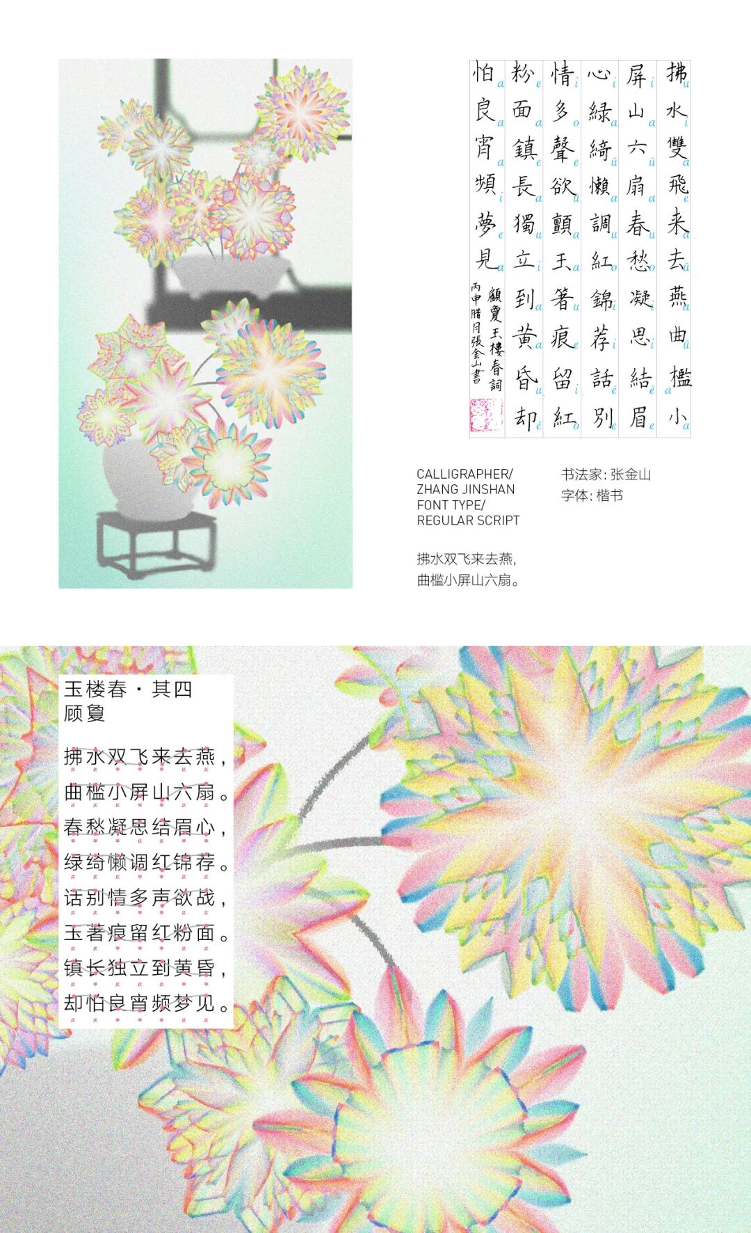 我亲历了北京2022年冬奥会开幕式的仪式前表演《一起向未来》的全程设计与制作,主要负责“福立方”的环节,运用了中国传统剪纸元素与万花筒进行结合,根据万花筒成像原理以编程形式构建了一个参数化的设计模型。这一实践经历给我很大的收获与启发,由此延用了万花筒的设计模型,并结合中国传统诗词格律创作出《字里花间》。作品名意为“字成一花,花间有字”,灵感来源自“梦笔生花”,即文人笔下所至开出一片片花朵,表示文笔出色。我在中国最早的文人词集《花间集》中节选十八首词,搜集整理这些词的书法作品,而后将逐个字转化成花,并且运用了诗词格律和万花筒成像原理,每一朵花的结构都取决于文字的字形,将诗词的韵律感融于其中。我希望以一种浪漫的方式展现中华诗词之美,从而探索如何借助科技的力量赋能艺术,讲述中国故事。视觉呈现方式是动态影像和龙鳞装书籍。