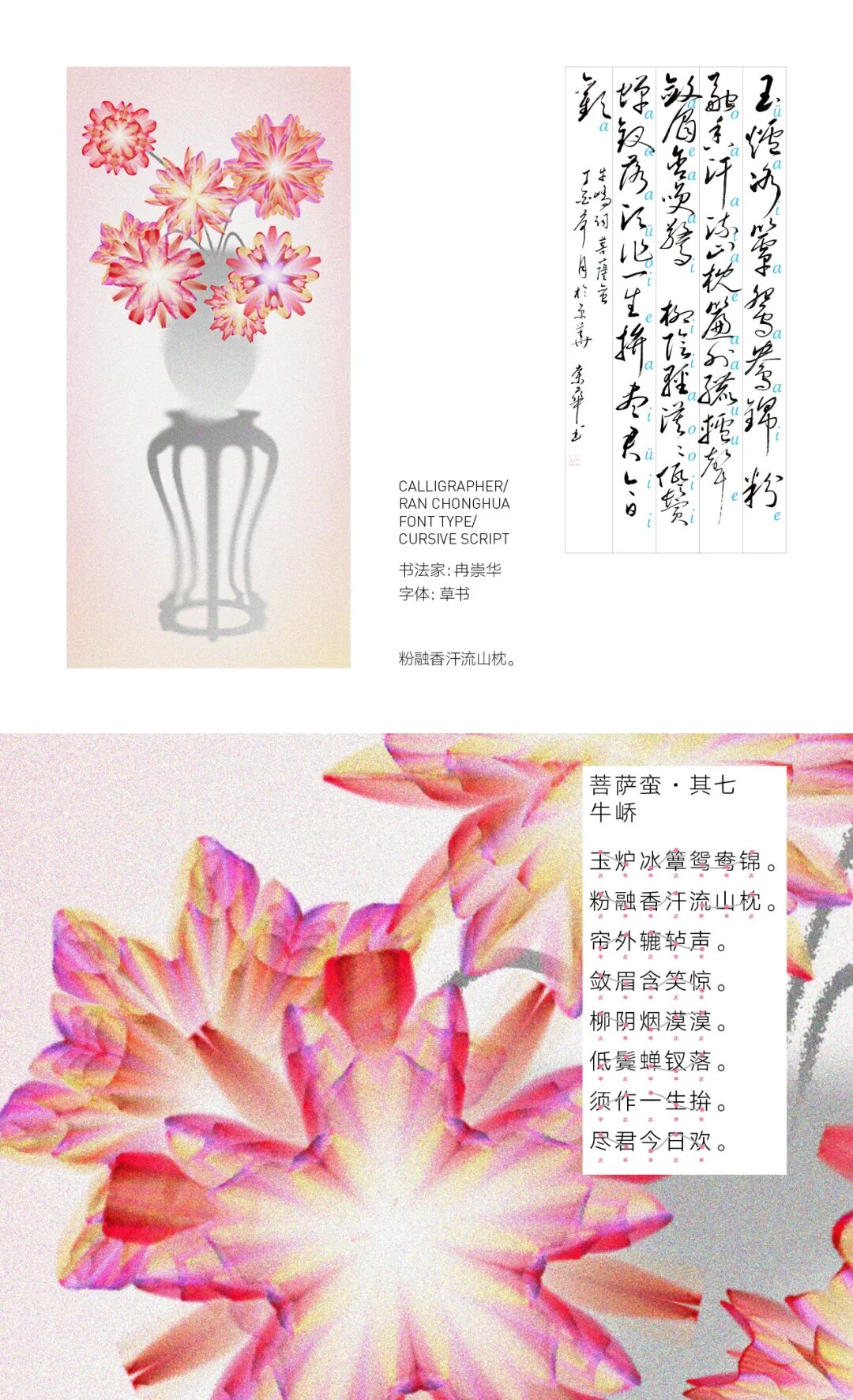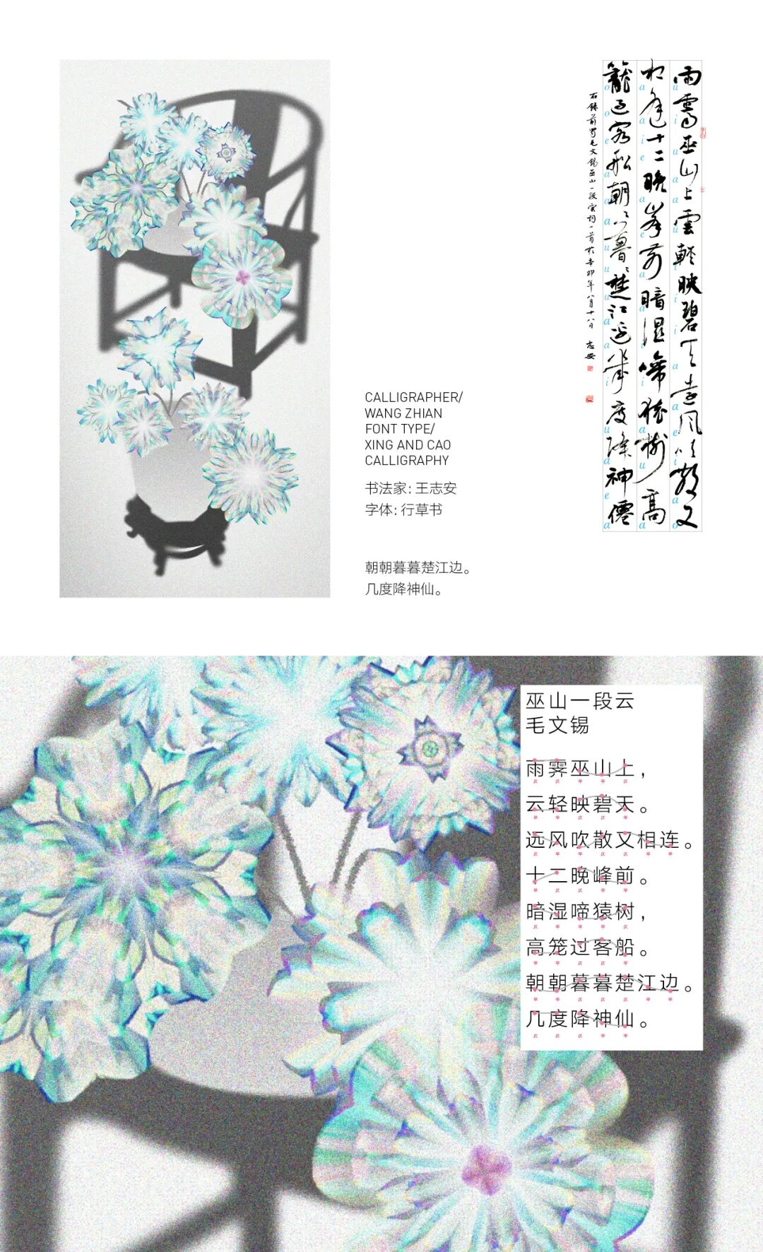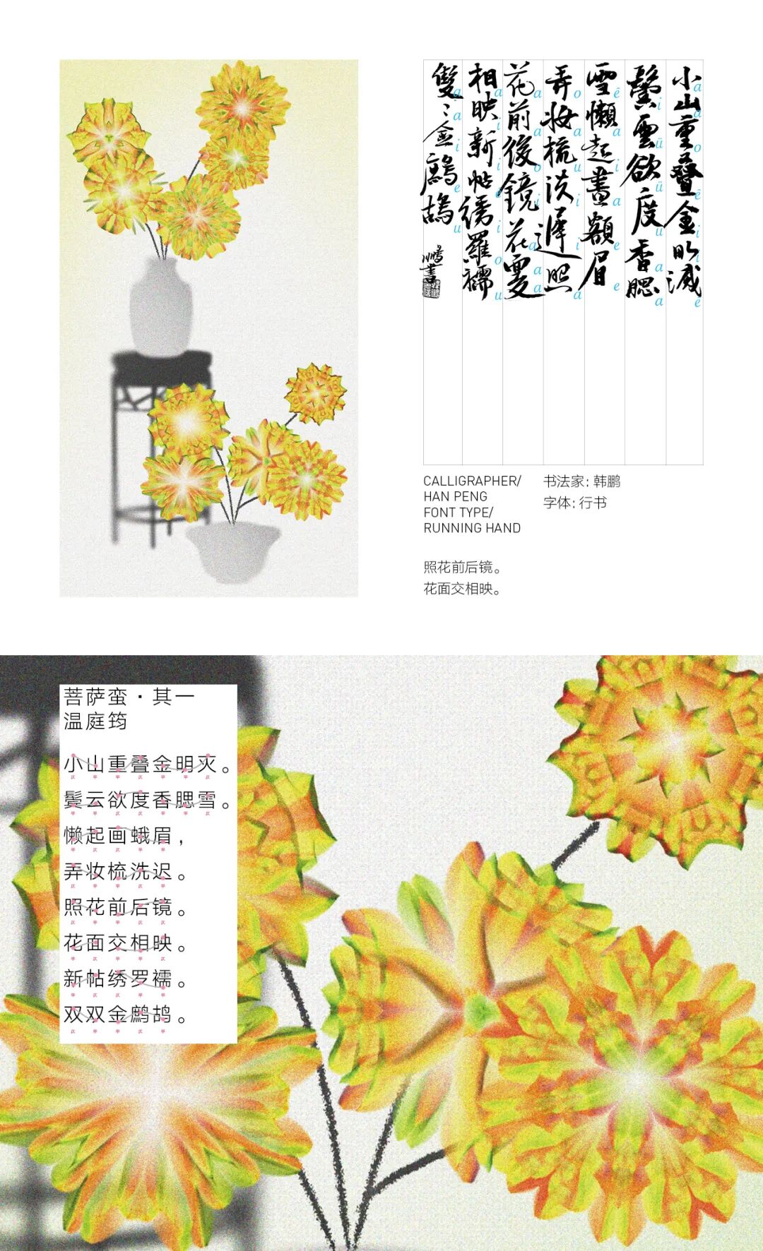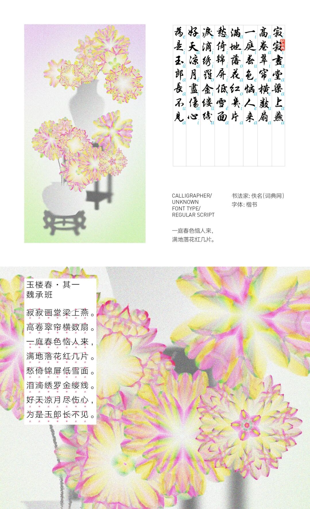 我亲历了北京2022年冬奥会开幕式的仪式前表演《一起向未来》的全程设计与制作,主要负责“福立方”的环节,运用了中国传统剪纸元素与万花筒进行结合,根据万花筒成像原理以编程形式构建了一个参数化的设计模型。这一实践经历给我很大的收获与启发,由此延用了万花筒的设计模型,并结合中国传统诗词格律创作出《字里花间》。作品名意为“字成一花,花间有字”,灵感来源自“梦笔生花”,即文人笔下所至开出一片片花朵,表示文笔出色。我在中国最早的文人词集《花间集》中节选十八首词,搜集整理这些词的书法作品,而后将逐个字转化成花,并且运用了诗词格律和万花筒成像原理,每一朵花的结构都取决于文字的字形,将诗词的韵律感融于其中。我希望以一种浪漫的方式展现中华诗词之美,从而探索如何借助科技的力量赋能艺术,讲述中国故事。视觉呈现方式是动态影像和龙鳞装书籍。
