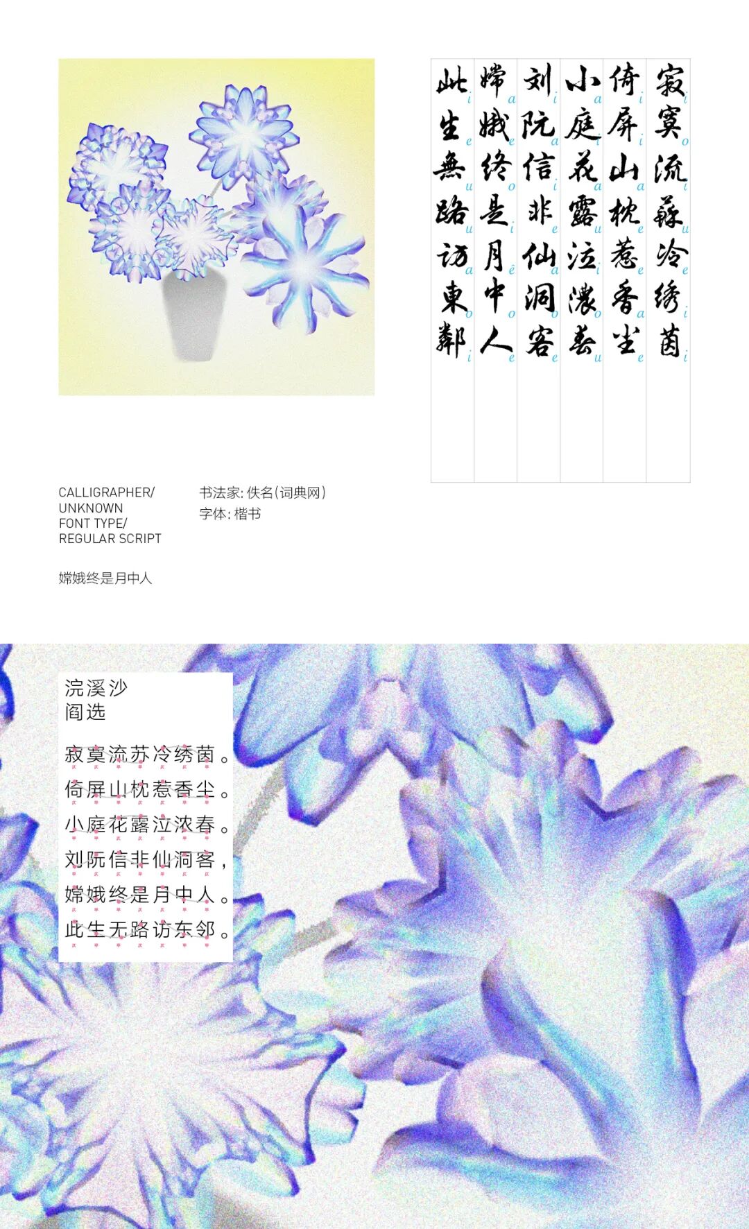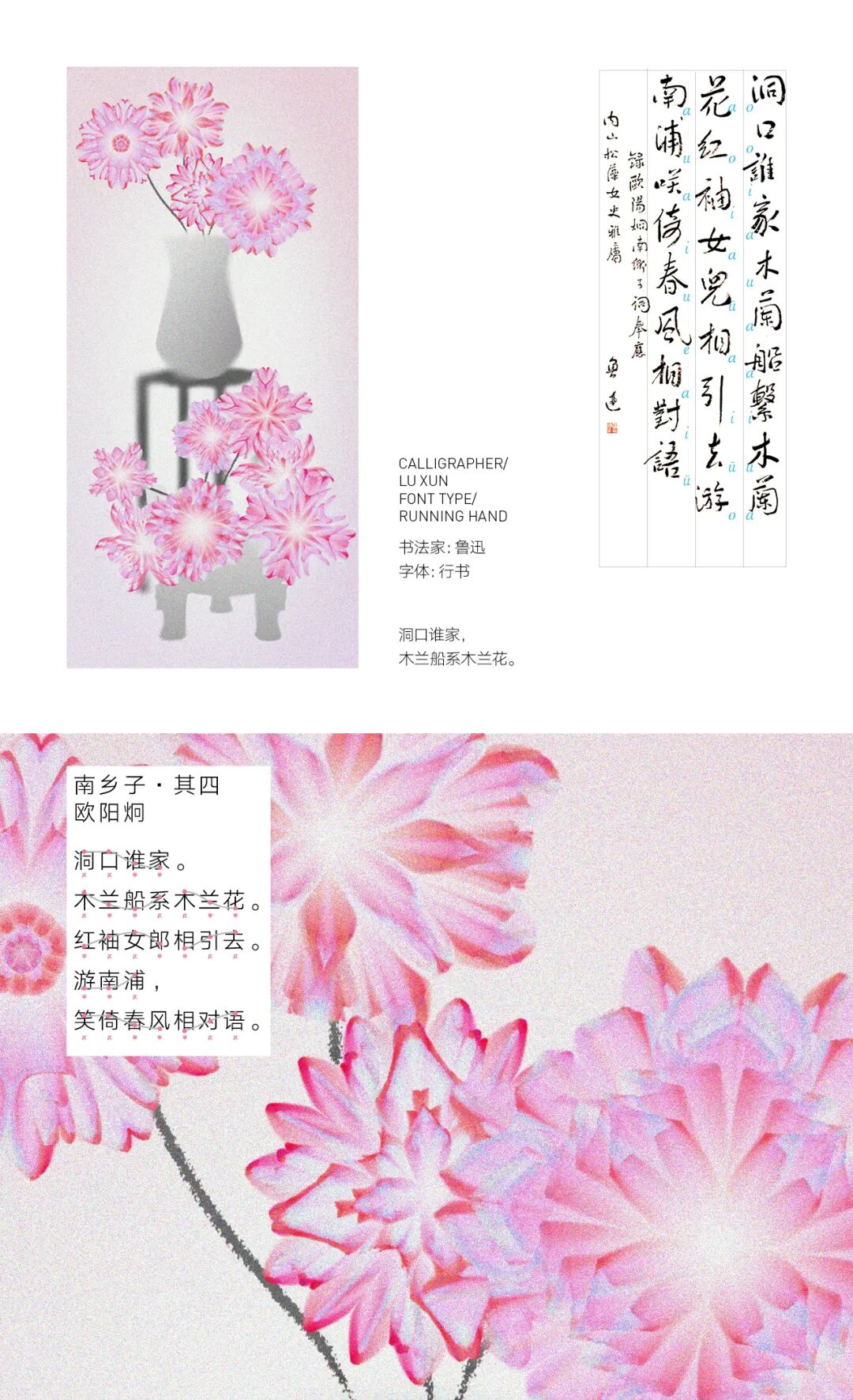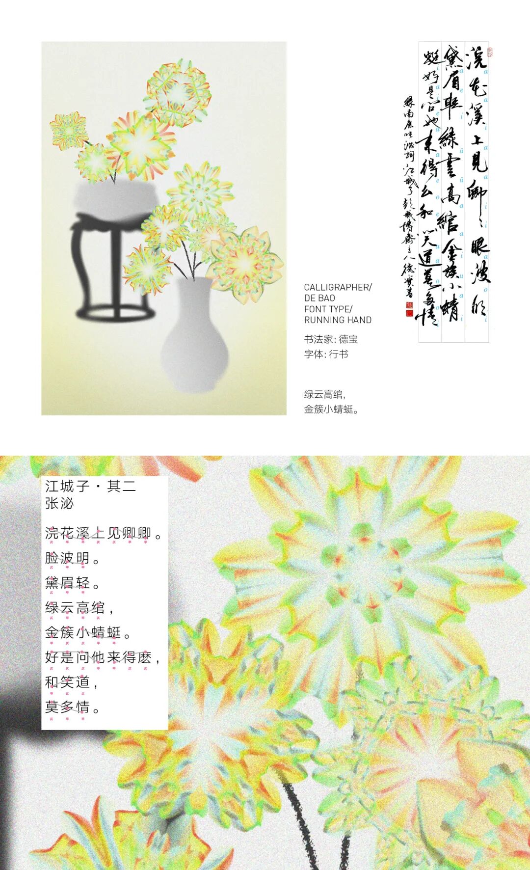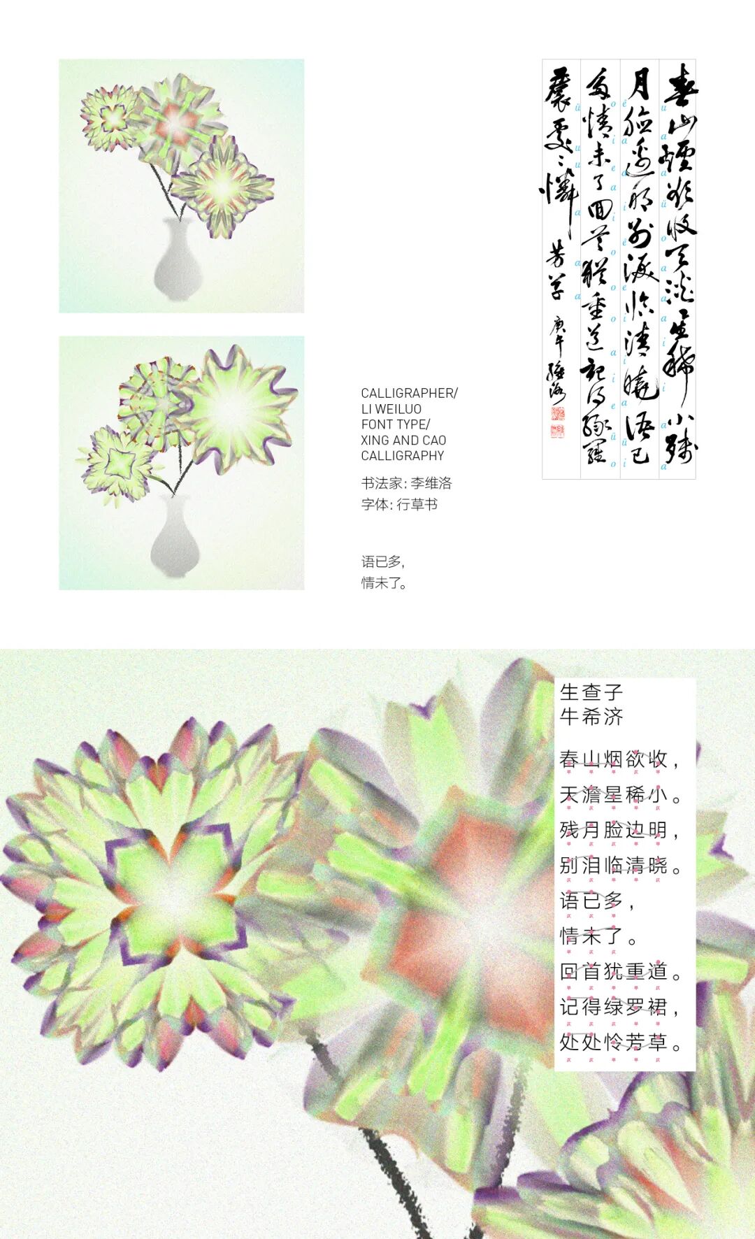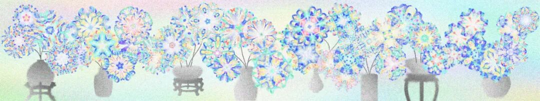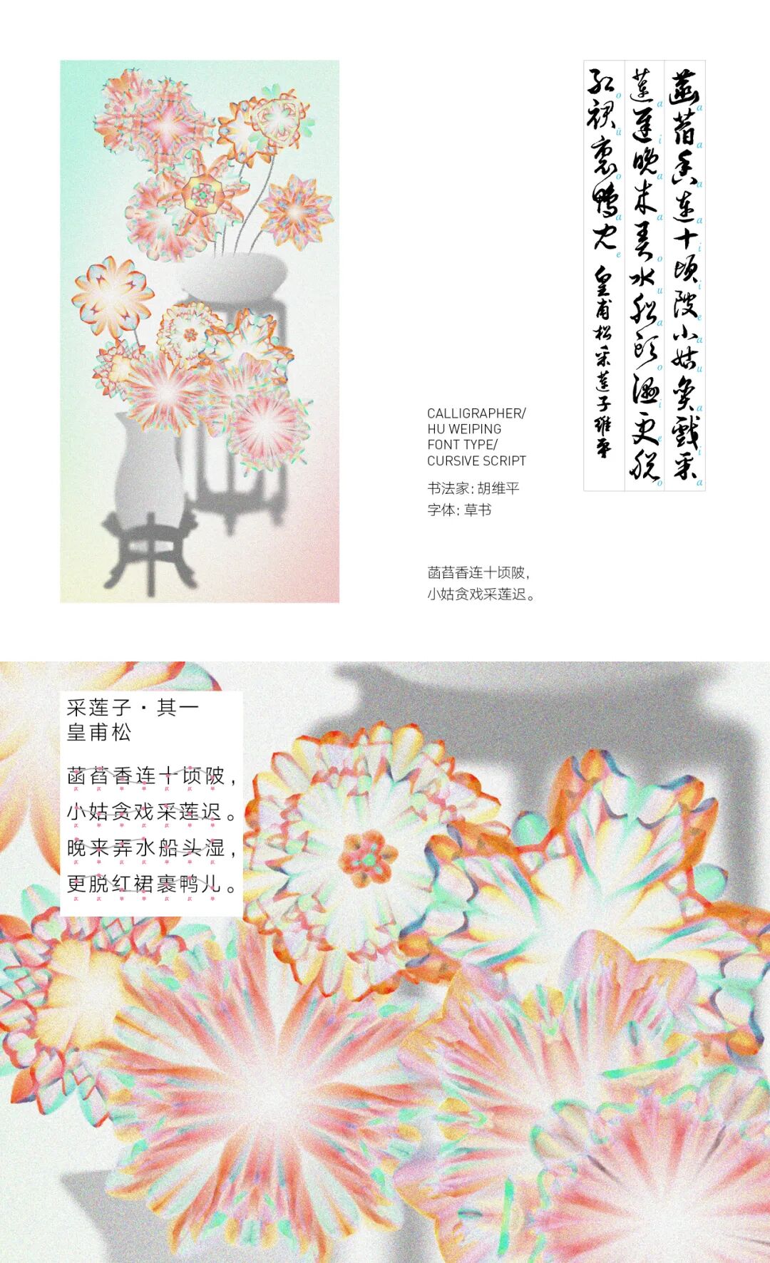 我亲历了北京2022年冬奥会开幕式的仪式前表演《一起向未来》的全程设计与制作,主要负责“福立方”的环节,运用了中国传统剪纸元素与万花筒进行结合,根据万花筒成像原理以编程形式构建了一个参数化的设计模型。这一实践经历给我很大的收获与启发,由此延用了万花筒的设计模型,并结合中国传统诗词格律创作出《字里花间》。作品名意为“字成一花,花间有字”,灵感来源自“梦笔生花”,即文人笔下所至开出一片片花朵,表示文笔出色。我在中国最早的文人词集《花间集》中节选十八首词,搜集整理这些词的书法作品,而后将逐个字转化成花,并且运用了诗词格律和万花筒成像原理,每一朵花的结构都取决于文字的字形,将诗词的韵律感融于其中。我希望以一种浪漫的方式展现中华诗词之美,从而探索如何借助科技的力量赋能艺术,讲述中国故事。视觉呈现方式是动态影像和龙鳞装书籍。