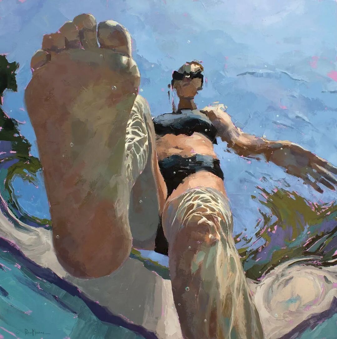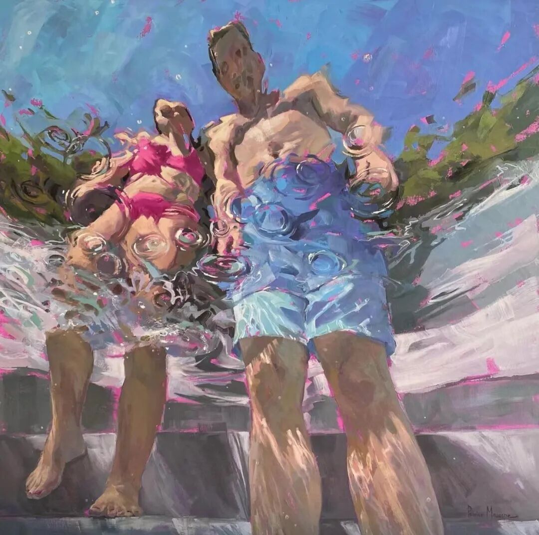 Michele Poirier Mozzone 以水下的视角去描绘水面上的人物样貌,不仅画风奇特,而且每一幅画都非常有质感。画面中描绘了水波的纹路,在不同波纹下的人物变形也非常真实形象,尤其是不同颜色的运用和搭配,让作品的呈现更加完美。