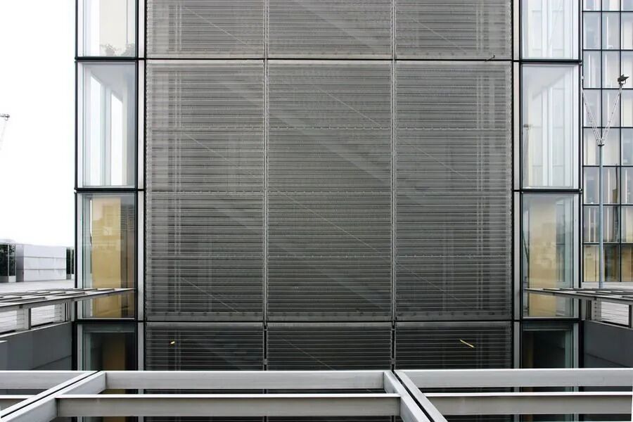 金属冲孔板是一种非常常见的建筑材料,多用于公共建筑及商业建筑外立面及室内设计。顾名思义,冲孔网是一种按一定大小,间距,形状,通过机床加工打孔得到的一种金属板材。作为建筑立面材料时通常以干挂系统挂在建筑立面外部形成第二表皮,因此具有良好的通风性和抗冲击性。