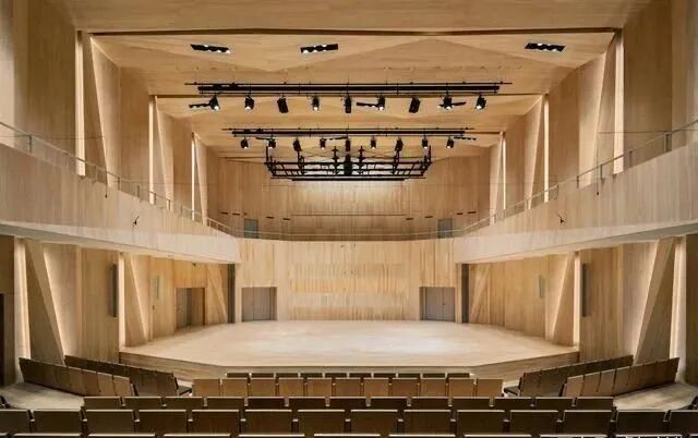 提到擅用木材的建筑师,就不得不说到另一位日本建筑师隈研吾,这位成长于日本经济泡沫时期的建筑师,提倡“负建筑”的概念,并认为建筑师应该谦卑谨慎地使用“小场所”的材料,技术,和工匠,而木材就是隈研吾认为“更利于建造有人情味的都市”的自然材料。他在2021年落成的桐朋学园宗次大厅就是一所用CLT建造的音乐大厅,这座宛如由木头编织而成的音乐场所,外部立面用依次旋转的CLT板材包裹,形成乐器琴弦一样具有张力的效果,内部也完全由CLT板材打造,不仅大大缩短工期,也更加防火隔音。