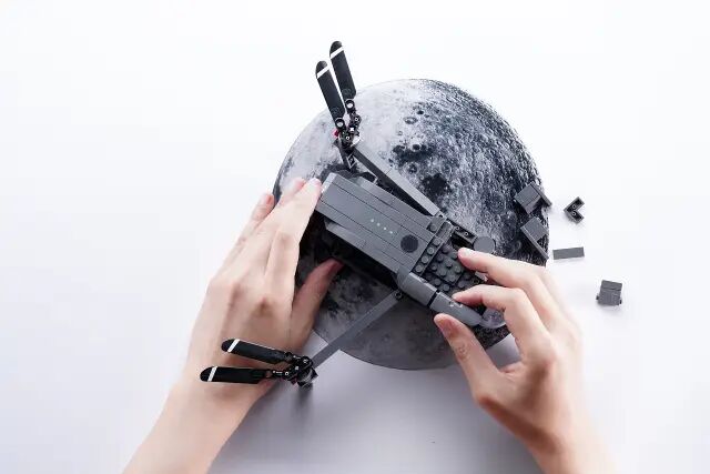 概念源于旅行者金唱片(Voyager Golden Records),是一张于1977年随两艘航海家探测器发射到太空的唱片。将地球与月球的相关信息以二进制图形形式放在盖板上,防止DJIER在太空中迷失了方向。特殊纹理的透明盖板,开箱前覆盖在月球表面呈现马赛克效果,开箱取走盖板看见清晰的月球照片,呼应内容物积木同时象征从地球到月球;由远到近;观看月球模糊到清晰的过程。(设计:DJI_Design)
