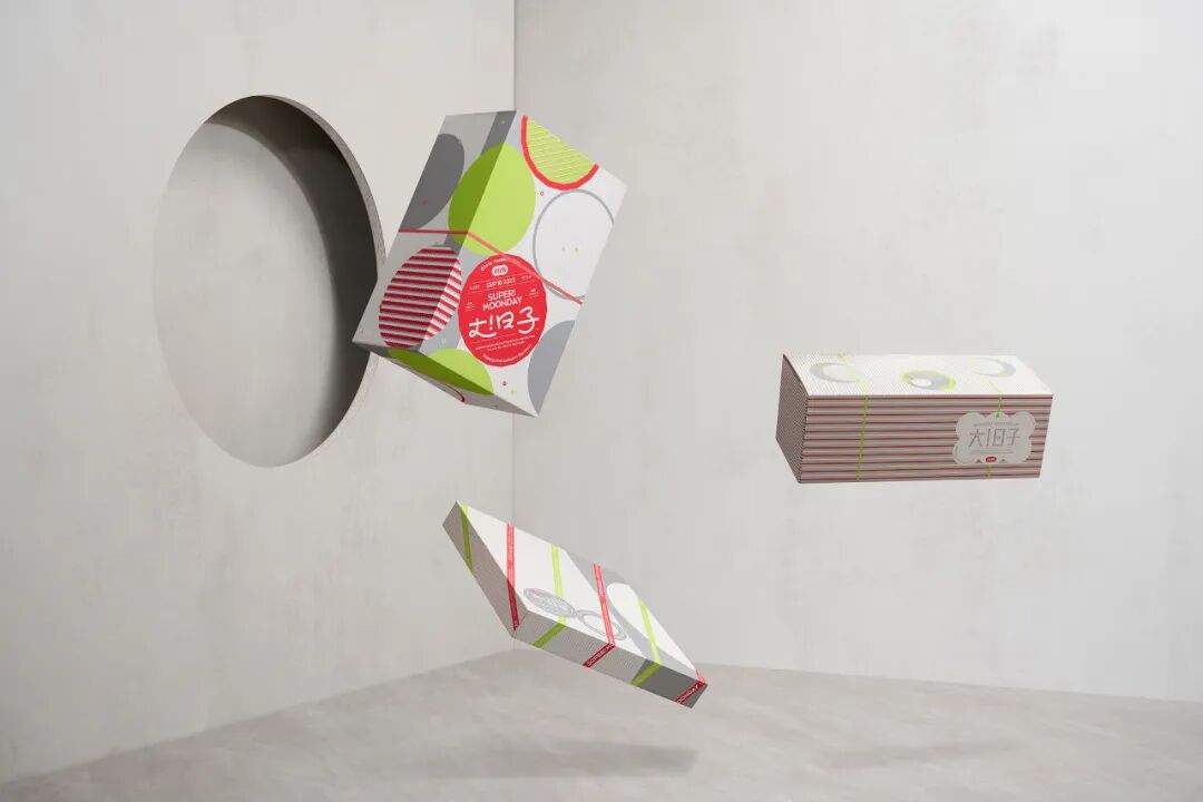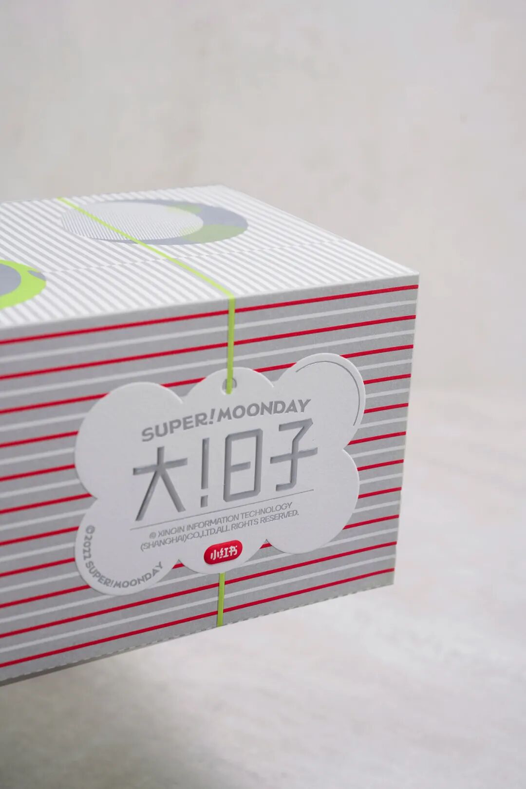 小红书今年的礼盒主题为【SUPER!MOONDAY】绑带式包裹,把三个礼盒紧紧的链接在一起,就像月圆之夜,团圆的一家人。