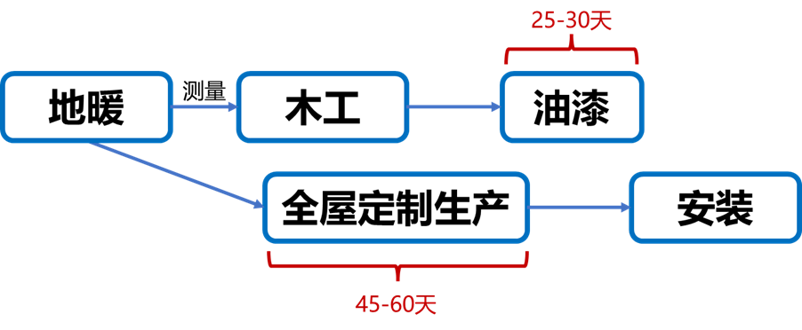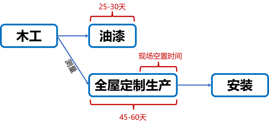 究其根源,是全屋定制需要在泥木验收后,才能去复尺下单(有些供应商甚至要等到油漆工结束后才能去复尺),从下单到生产完成,大约需要45-60天。而泥木验收结束,至油漆验收,通常只需要25-30天。中间就有了将近一个月的时间差。