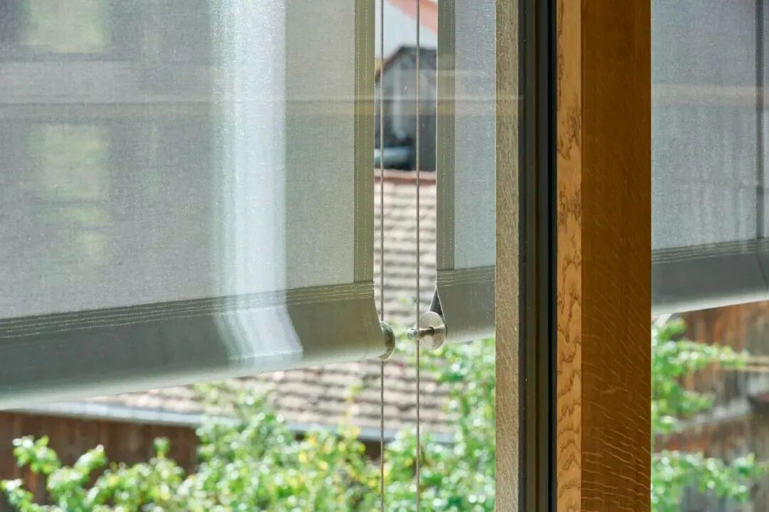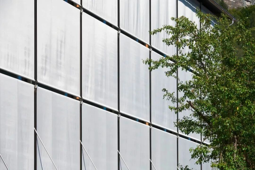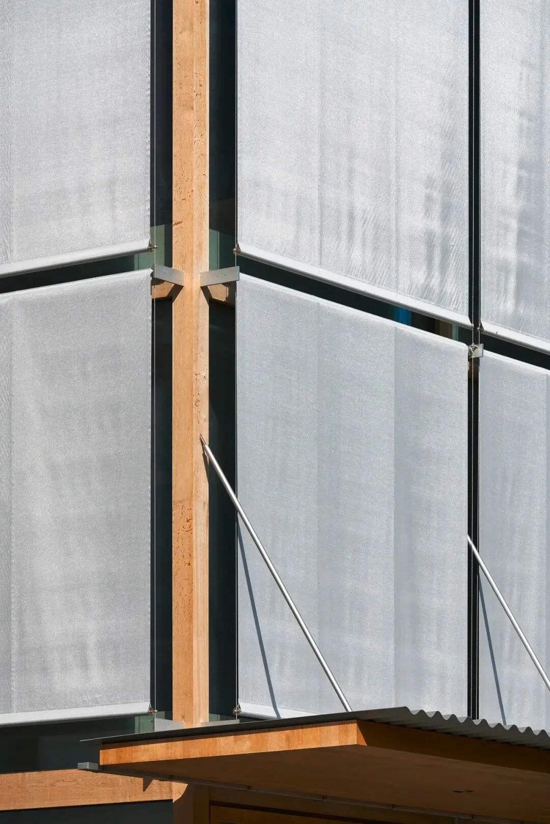 建筑围护结构是木制结构,它承载了所有的外墙元素。丝网遮阳网保护着玻璃幕墙。遮阳网的导缆器贯穿三层楼高的立面,并连接在铬钢制成的丝状杆件上。