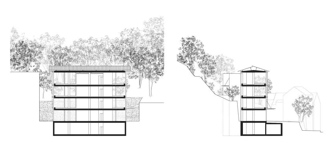 新工作室由旧大谷仓改造,原建筑的外墙被保留了下来,与新的工作室的大部分外墙保有距离,作为挡土墙使用。一方面,建筑的这种布局强调了体量的独立性,另一方面,它也与瓦砾墙和它背后的陡峭地形建立了密切的关系。
