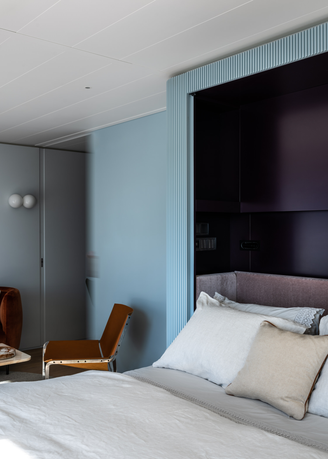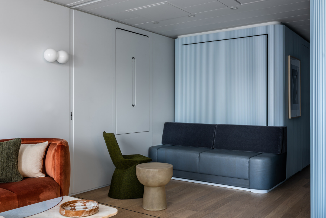 他在柯布西耶理念的基础上,以小规模生活、模块化组织为核心,设计了 PIED-À-MER游艇内面积 55㎡的海上度假屋。