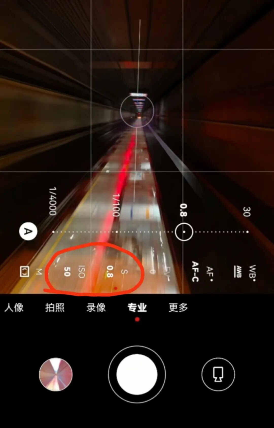 手机需要调参数,使用专业模式:感光度调50、快门速度0.6-0.8秒,在地铁跑动起来之后拿稳手机拍。