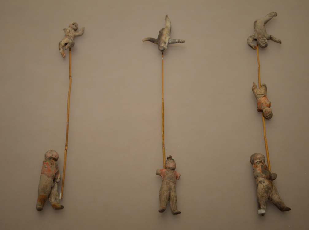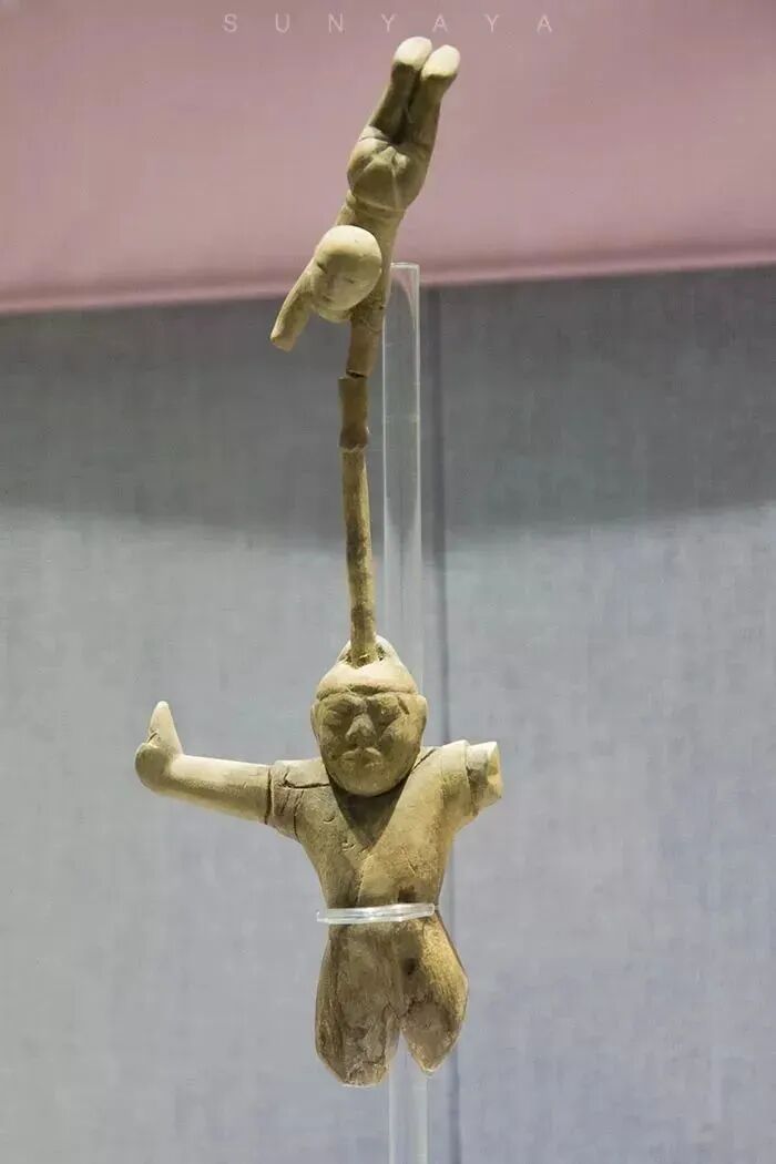 其中最值得一提的是展览中12件不同内容的百戏俑,主要类型有戴竿俑、倒立俑、相扑俑胡人袒腹俑以及参军戏俑。