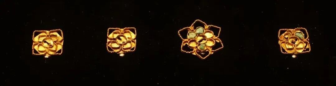 展览中的4件的金饰背面有孔,表面镶有宝石,应当为其所使用的金花宝钿。4件金饰总重仅1.8克,直径不过1.8厘米。要在指尖大小的金饰上将细如发丝的金丝掐成的花形边框整齐地焊接在薄如蝉翼的金片上,外框周边再焊接一圈针尖般的金珠,看不出丝毫焊缝,并在一千多年后的今天依然没有开裂、脱落,足以体现当时金银细工的工艺之高。