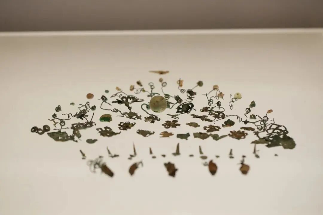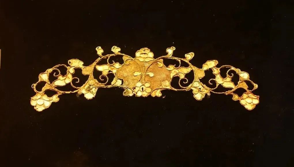 除了“东园秘器”,金乡县主冠饰残件、金筐宝钿花饰、鎏金铜饰等精美文物,亦能看出县主日常穿戴极尽奢华,其制作使用了“炸珠”“掐丝焊”等金银细工中的尖端技艺,亦为珍品。其中人气最高的,便是金乡县主的这组冠饰残件。