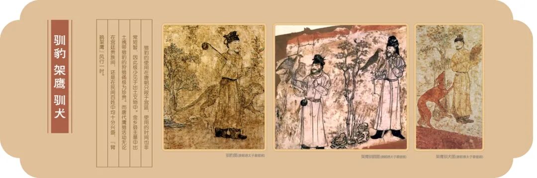 金乡县主墓共出土各类骑马俑中,狩猎俑驮鹿、抱犬、带豹、带猞猁、架鹰,所携多为出自西域的猛禽猛兽。伎乐俑所持乐器则有排箫、横笛、胡笳、羯鼓、琵琶、铜钹、腰鼓、箜篌及筚篥等,多为胡乐器。