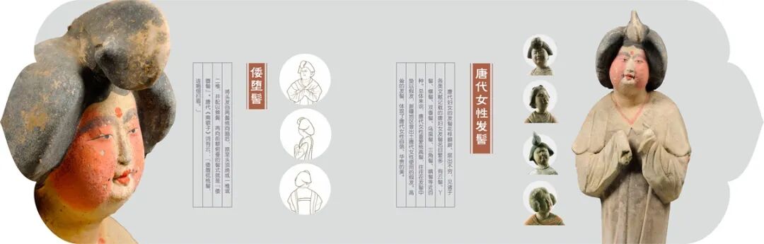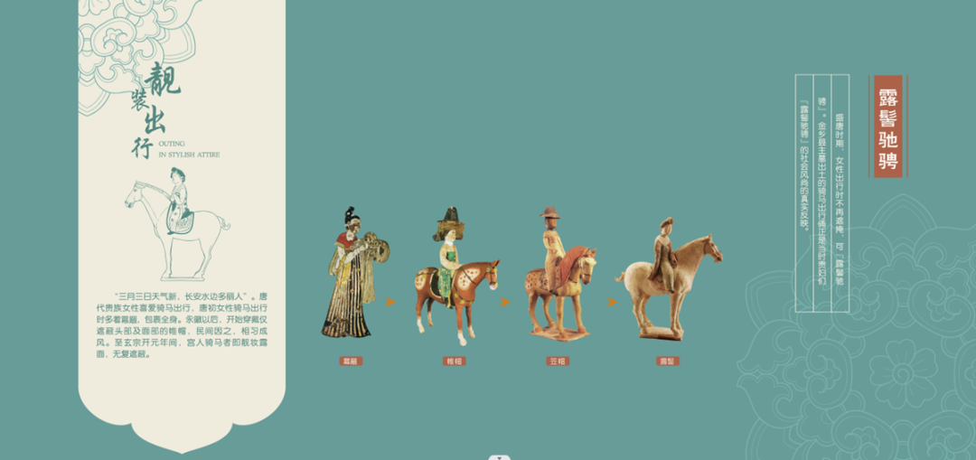 唐代文化空前开放,女子骑马之风盛行,开元年间,妇女靓妆露面、纵马畅游更是司空见惯。看这些骑马出行女俑,身着窄袖衫和长裙,内衬半臂,披帛搭肩,“倭堕髻”高耸,优雅自信,把唐朝女子流行装束和时尚热门发型一览无遗。