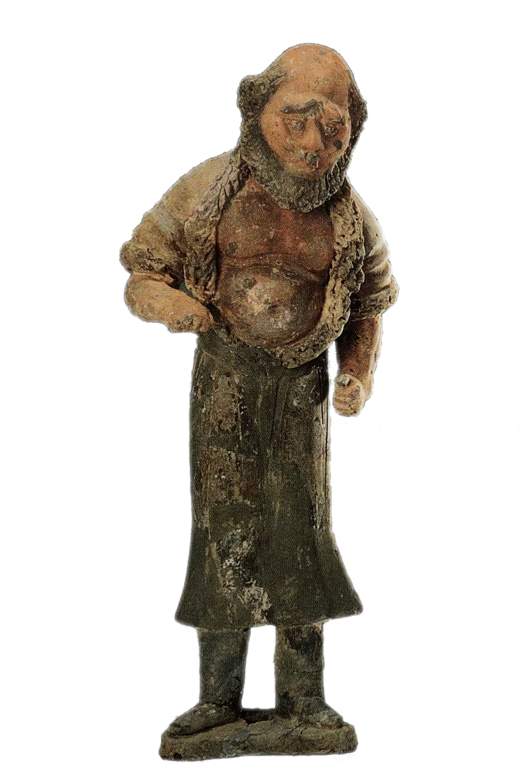 据葛承雍先生考证,胡人袒腹俑是来自西域的幻术表演艺人,形象粗犷怪异,造型独特,故意挺肚袒胸露腹表演幻术,这也是西域胡人标识性的“胡俗”文化符号。