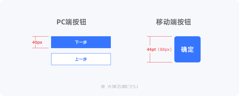 在PC端设计按钮,因为鼠标的精准点击,我们通常会将按钮设计的小一些,同时也能让整个界面看起来更加细腻,只要不影响操作,36px~48px范围内的按钮还是比较常见的。但设计移动端按钮时,我们要更多的考虑到物理尺寸,即手指(指尖)在操作时需占用的实际范围。