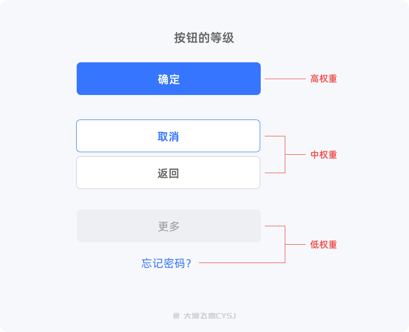 高权重:带有填充色的主操作按钮,当同一个页面存在多个按钮,只允许存在一个高权重(主操作)按钮;