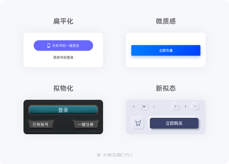 在UI设计中,几乎每个页面都存在按钮,样式、种类也有很多,但设计风格常见的也就几种,例如扁平化、微质感、拟物化、新拟态(概念)...