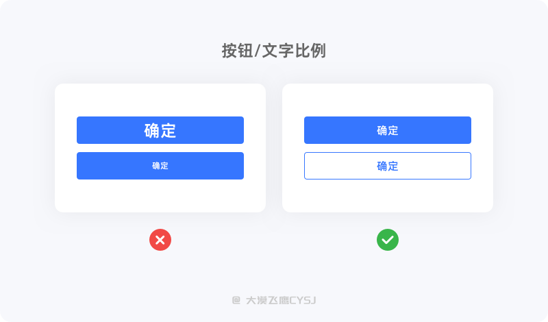 按钮中的文字太大或太小都会影响用户对信息接收的效率,大小比例需要适中。文字太大会感觉很拥挤(跟大家衣服买小了感觉一样),没有呼吸感,要给文字四周足够的空间,同时文字太小也会显得小气,看起来也比较吃力,不利于信息接收。