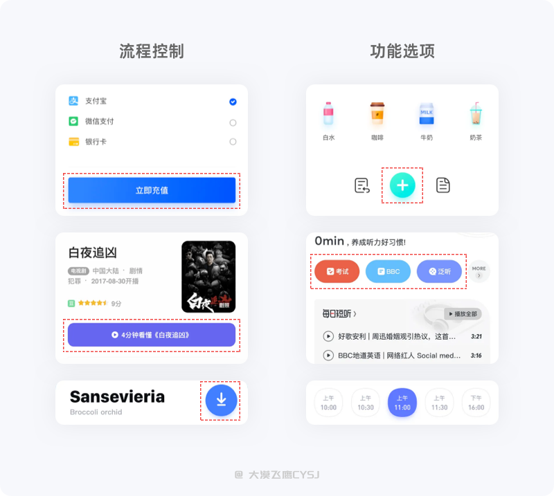 流程控制:常见的传统按钮,如支付、下一步、确定、保存等,容器承载着图标、图片+文案、文案。