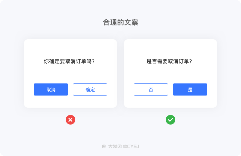 上图的文案歧义就很明显,自以为聪明的设计师想要挽留用户,刻意将主次按钮样式对换,希望用户操作不成功,那么用户在需要取消订单时就疑惑了,到底是点击「确定」还是主操作按钮「取消」才能取消成功呢?或许稍加思考,用户也能反应过来,但无疑增加了选择难度、思考时间及操作成本。