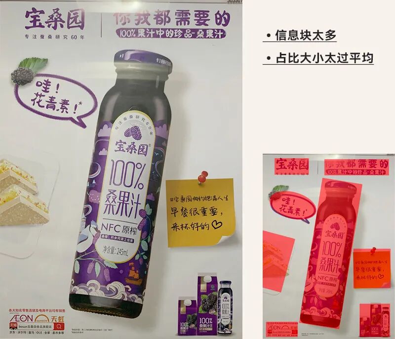 ❸ 排版太乱。虽然用了圆形色块进行整合,但是在这一组新信息里,有的文字排成弧线、有的文字竖排、有的文字横排、有的文字对齐排、有的文字错位排,同一个信息块里采用了太多不同的排版形式,而且组合得不好。