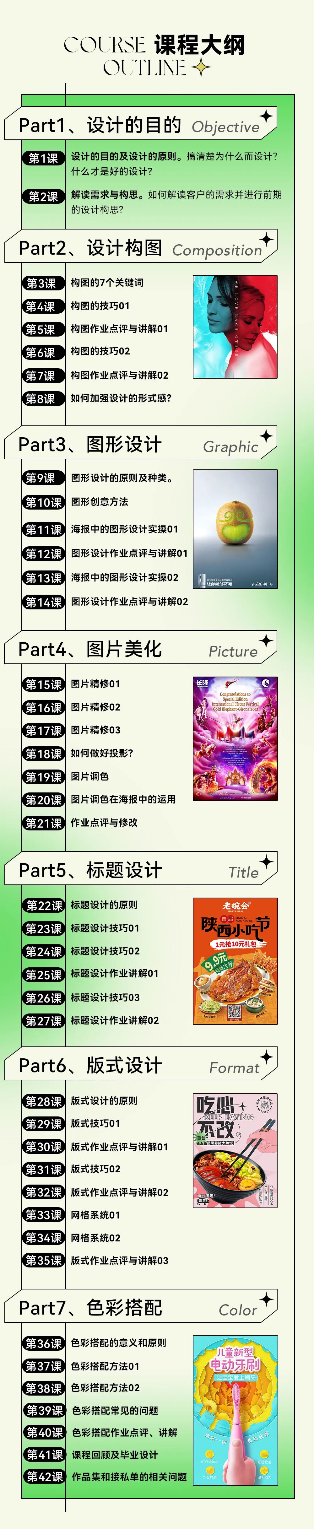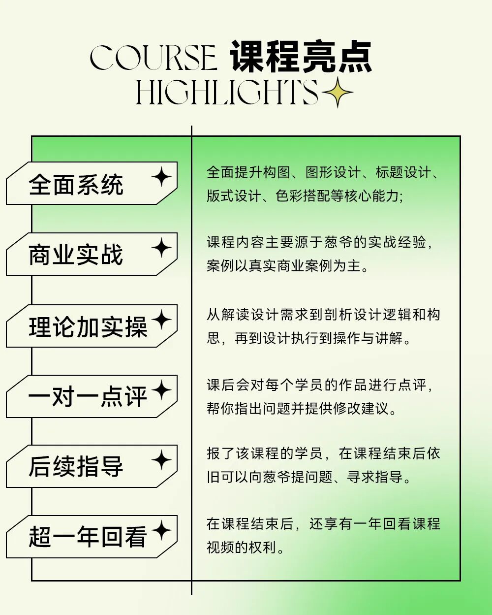 冰冻三尺非一日之寒,想要把版式做好需要长期的学习、实践、坚持。另外,版式的学问还有很多很多,这只是九牛一毛而已;而且版式设计也只是平面设计中的一个部分,与之同样重要的还有构图、图形设计、字体设计、色彩搭配等等,想要全面提升自己的设计水平,你必须要系统的学习。为此葱爷专门打造了一套设计课程。