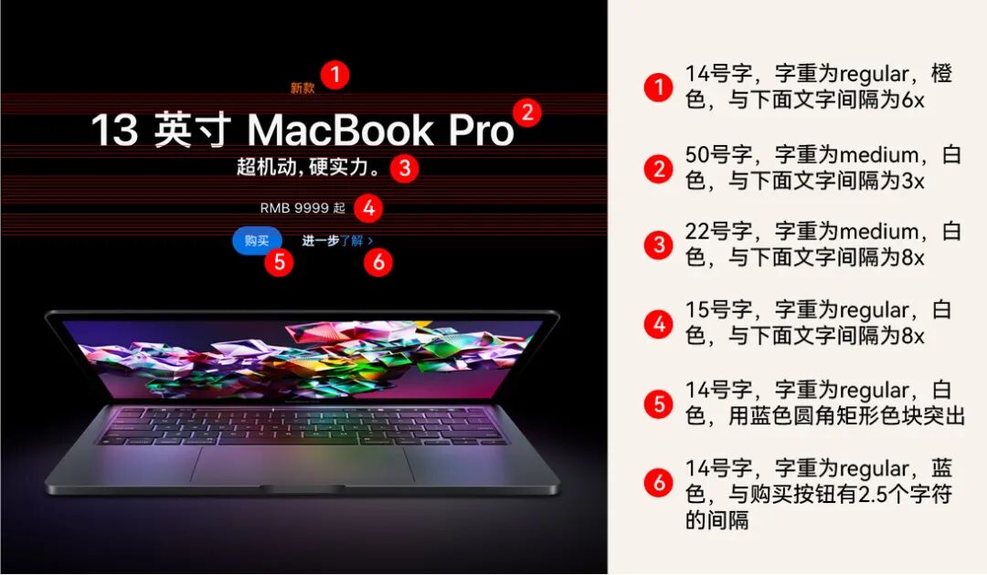 比如下图是苹果笔记本的banner设计,其每一行文字的视觉效果都有明显的区别,但并没有采用特别夸张的表现手法,字体和排版方向都是统一的。