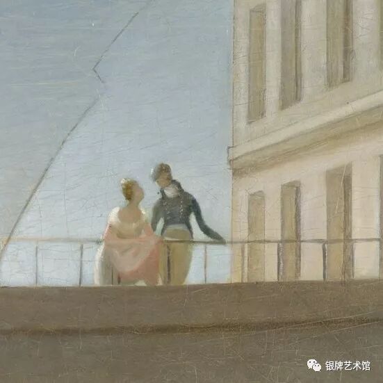 临窗远眺,一对恋人正在天台上互诉着衷肠,女子却心无旁骛,全神灌注于手中的画作。