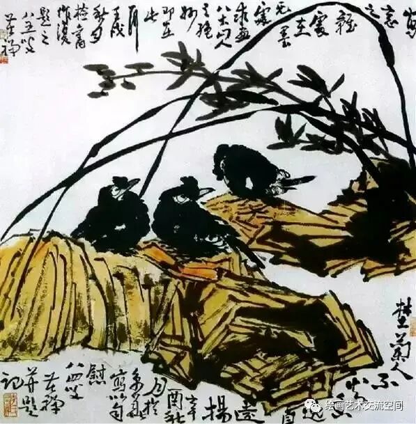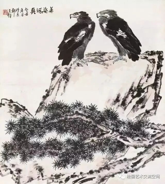 宁可叫“鸟找枝”,不可叫“枝找鸟”,鸟周围要空些,以突出鸟,这样更空灵、鲜明。鸟与枝的力量要相称,鹰居花梢,小鸟居大干均不宜。