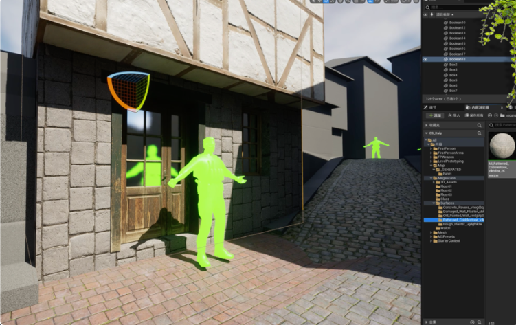 利用组件搭建完主体建筑之后对场景细节进一步的优化,运行场景后对视觉范围内的贴花与建筑融合度作出细化调整。