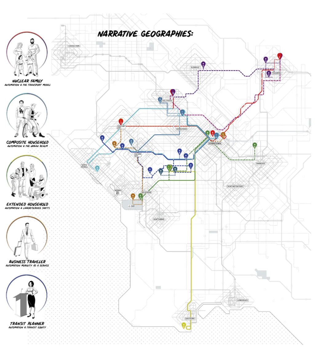 出于几个重要的原因,该项目将自己牢牢地定位在洛杉矶市作为试验田。洛杉矶是当代美国城市今天所面临的文化流动趋势的更大转变的一个典型例子。尽管人们对这个城市对汽车的热爱有着刻板印象,但洛杉矶曾经是交通发展的前沿阵地。在19世纪末,这个城市的骨干是建立在铁路扩张和投机性房地产开发上的,这就产生了城市在有轨电车郊区的蔓延。如果这个时期的城市可以被称为 "第一 "洛杉矶,那么 "第二 "洛杉矶则是有据可查的历史时期,在铁路线被拆除和私人汽车的政治/文化扩散之后,这个城市对汽车产生了痴迷。