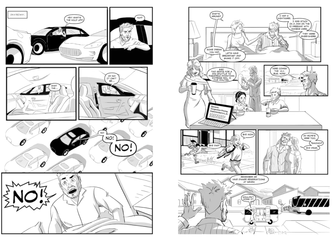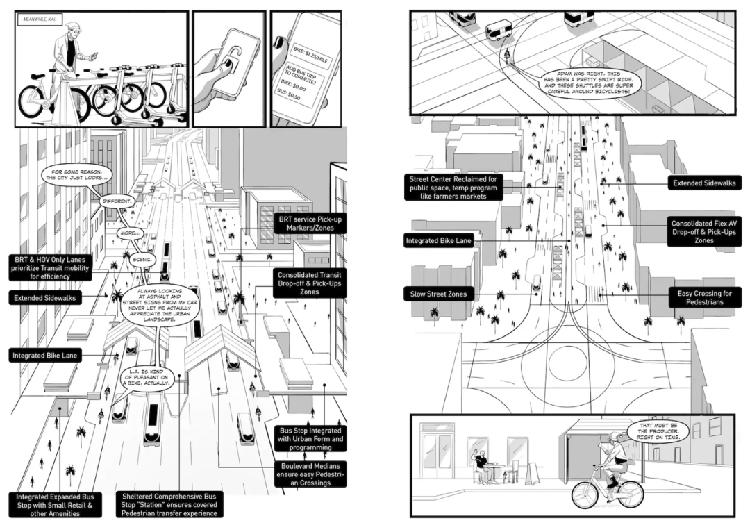 设想在不久的将来(2047年),自动驾驶汽车已经催化了交通模式的转变,自动驾驶公共交通将作为洛杉矶市区域城市发展的模式。