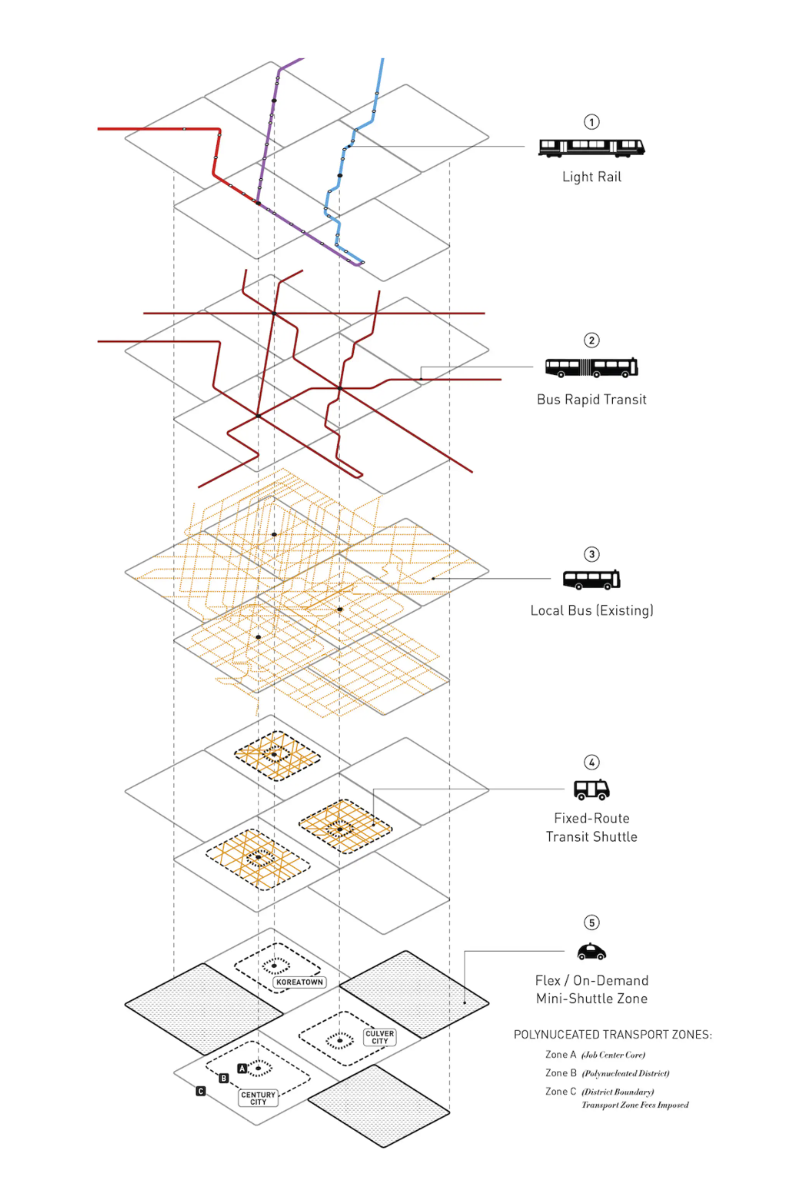 接下来的几十年,交通拥堵日益严重,环境恶化,公民领域日益萎缩,使我们来到了这个城市的 "第三次 "迭代,现在正大规模投资于公共交通。2016年,选民们批准了M措施,授予洛杉矶地铁1200亿美元,以在2047年之前建立一个21世纪的公共交通系统。这项大规模的投资有可能从根本上改变该地区的交通状况。虽然洛杉矶的交通机构一直专注于优先扩大城市的轻轨/地铁网络,但自动化为重新思考城市的公交网络提供了独特的机会。后者可以被用来重新构想整个NextGen公交网络,在这个网络中,一系列全新的公交车辆可以在灵活和按需的路线上运行,为低密度地区提供服务,填补最后一英里的流动性缺口,而现有的快速公交和地方公交中司机成本的消除将使服务频率和覆盖面都得到增加。