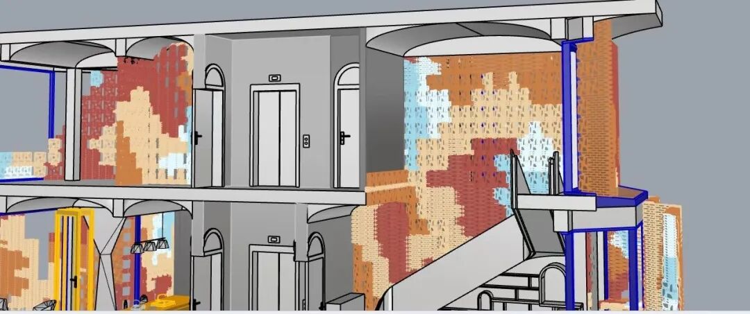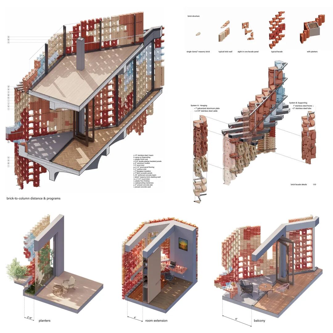 结合单体砖块的几何性质,我们设计出了一套立面悬挂系统。砖墙不再是笨重的支撑结构,而是也可以像挂板一样成为更灵活的立面元素。