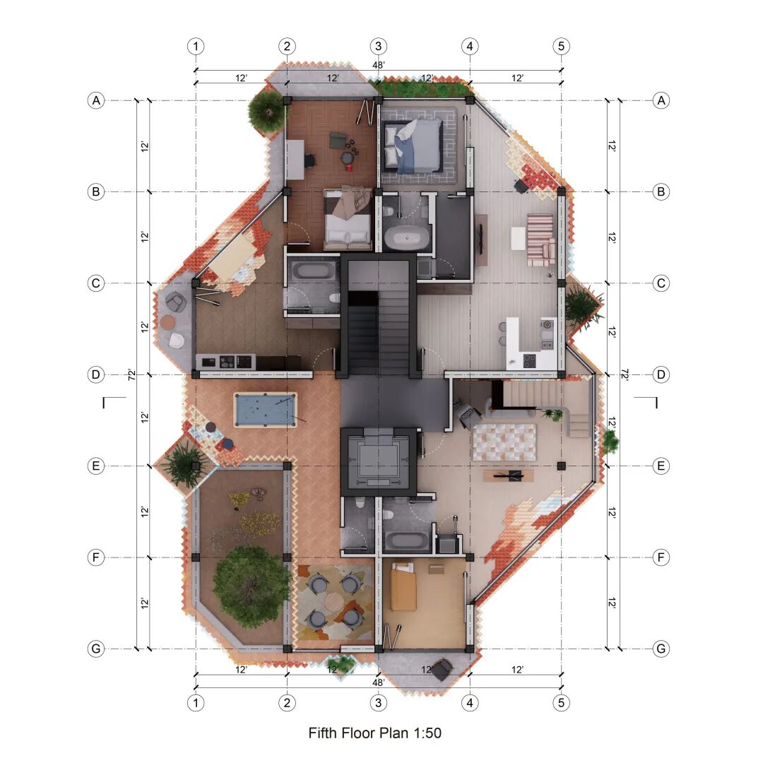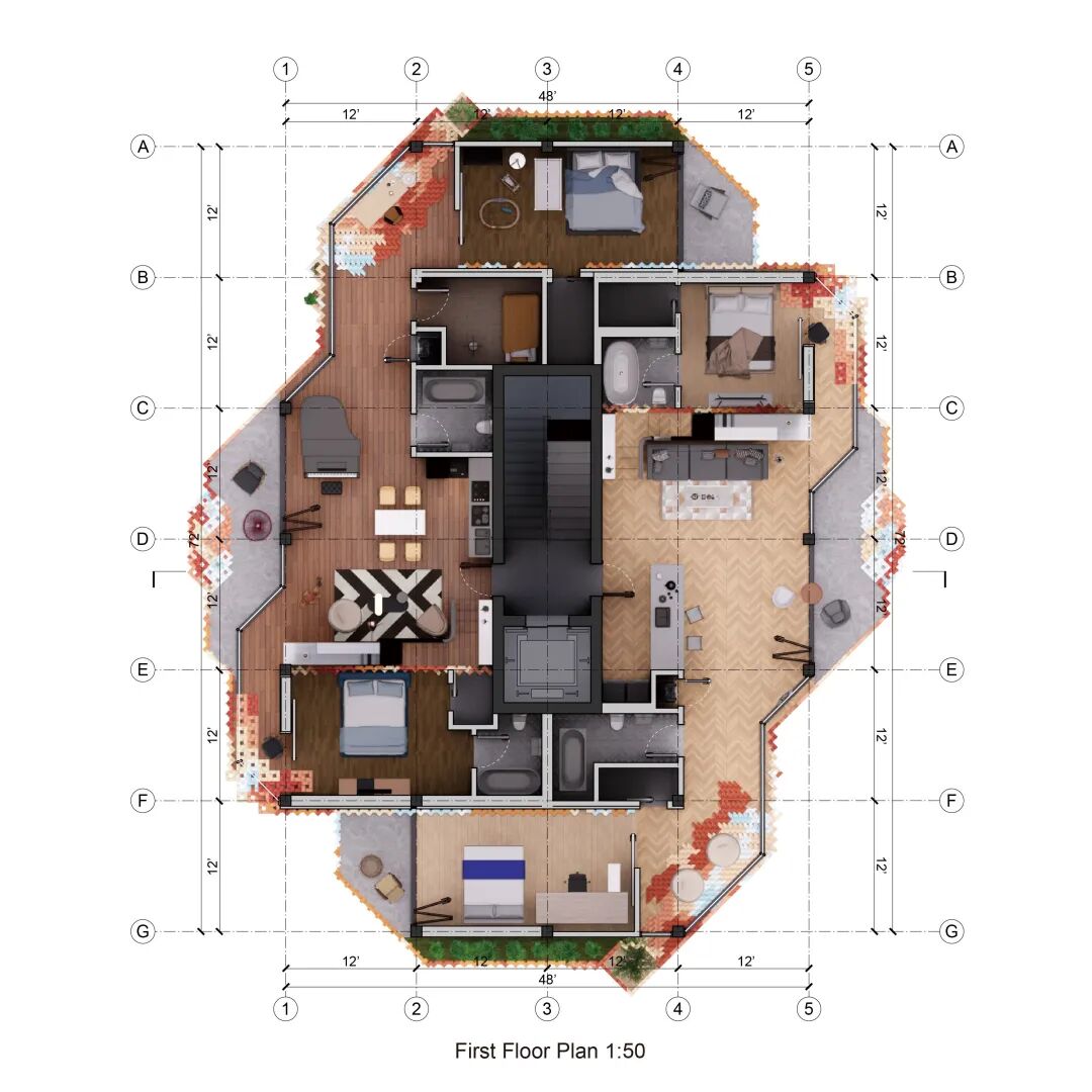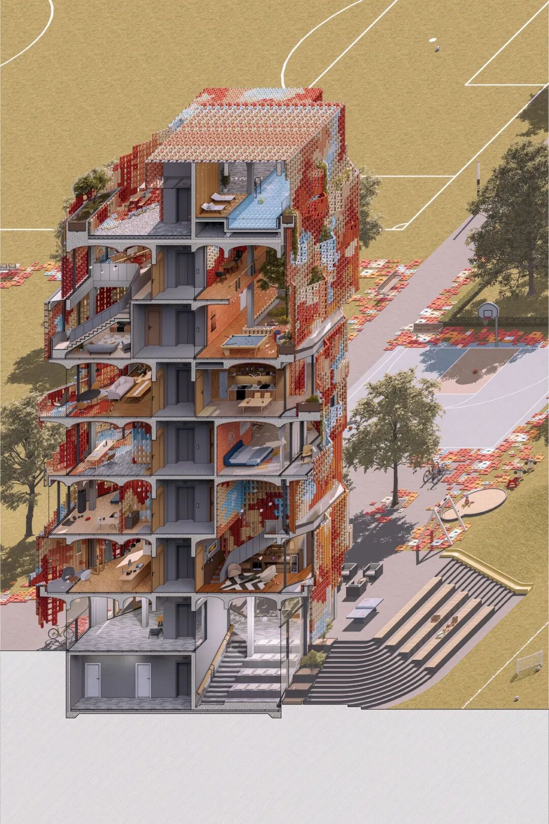 解决完所有有关砖的问题后,我们接下来的工作就是把砖墙应用在一个有温度的集合住宅空间当中。我们设想了一个六层住房、不同户型混住的社区规模,不同户型之间穿插着丰富的公共空间,鼓励社区之间的互动。在空间设计上,我们也继承了砖墙设计时丰富的植被覆盖,最大程度地将自然带入到居住空间中。