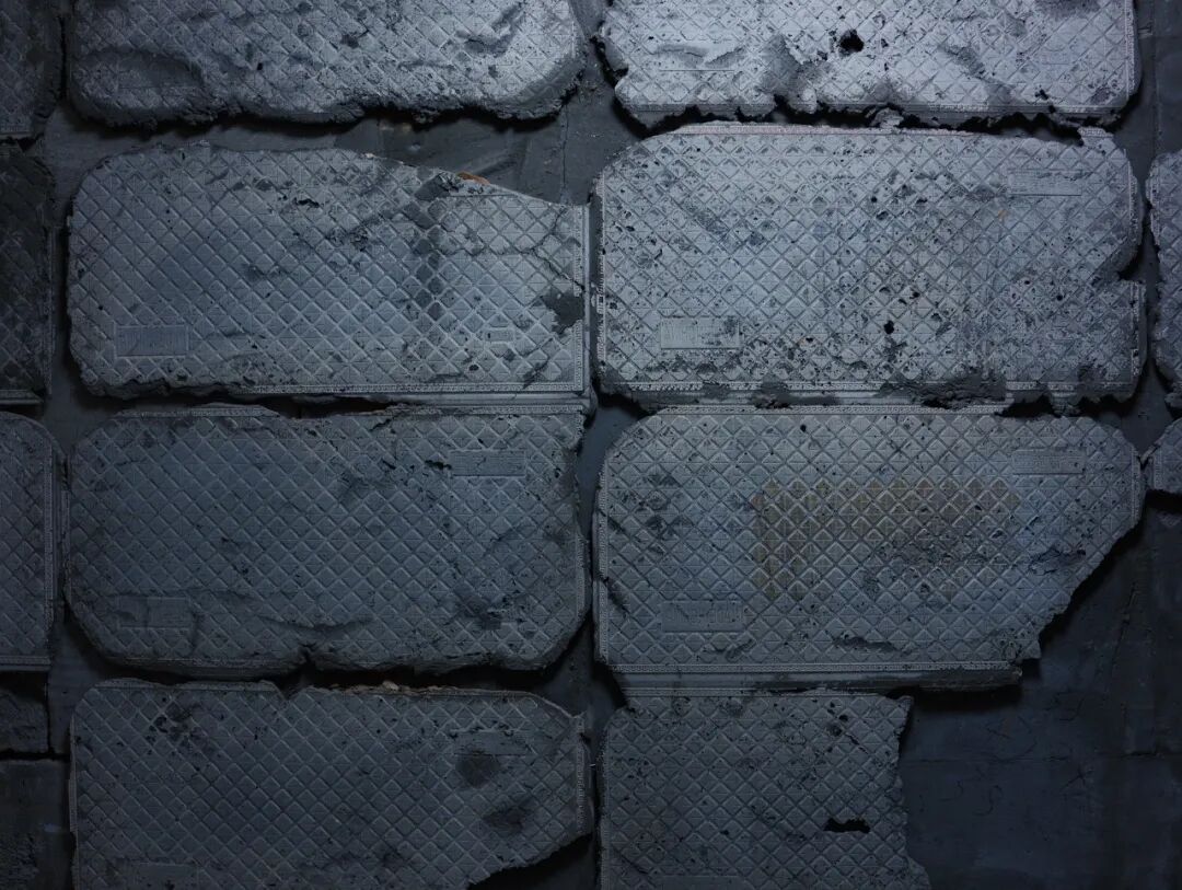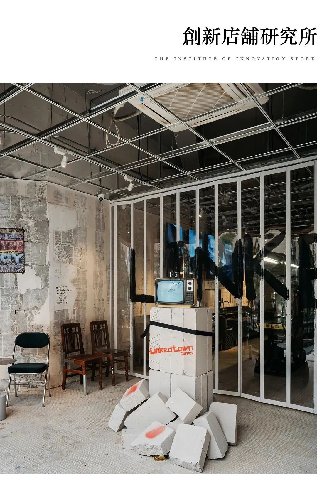 咖啡店半户外的沿街空间具有“过渡”和“连接”作用,空间的中央放着一座由砖块旧电视构成的装置,屏幕里影像迷离,充满了末日破败的机能感。