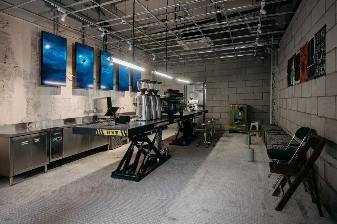 咖啡吧台足有6米的跨度,经由两个承重4000kg的举升机改造而成;空间整体氛围应循着冷金属色与灰色所带来的机能感,充满想象力的家具改造与数字艺术是空间的重要组成部分。