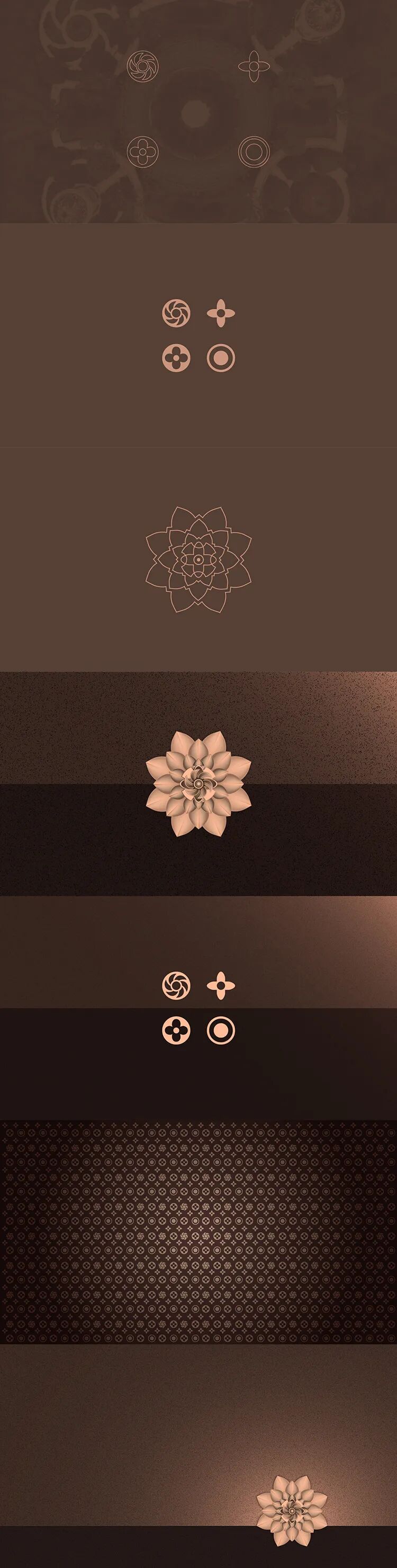 主形象的设计对标奢侈品牌,提取一朵盛开的山茶花作为视觉锚点。我们还从中心景观的四座特色花园提取视觉元素,组合成“老花”辅助纹样,营造出丰富、优雅的质感。
