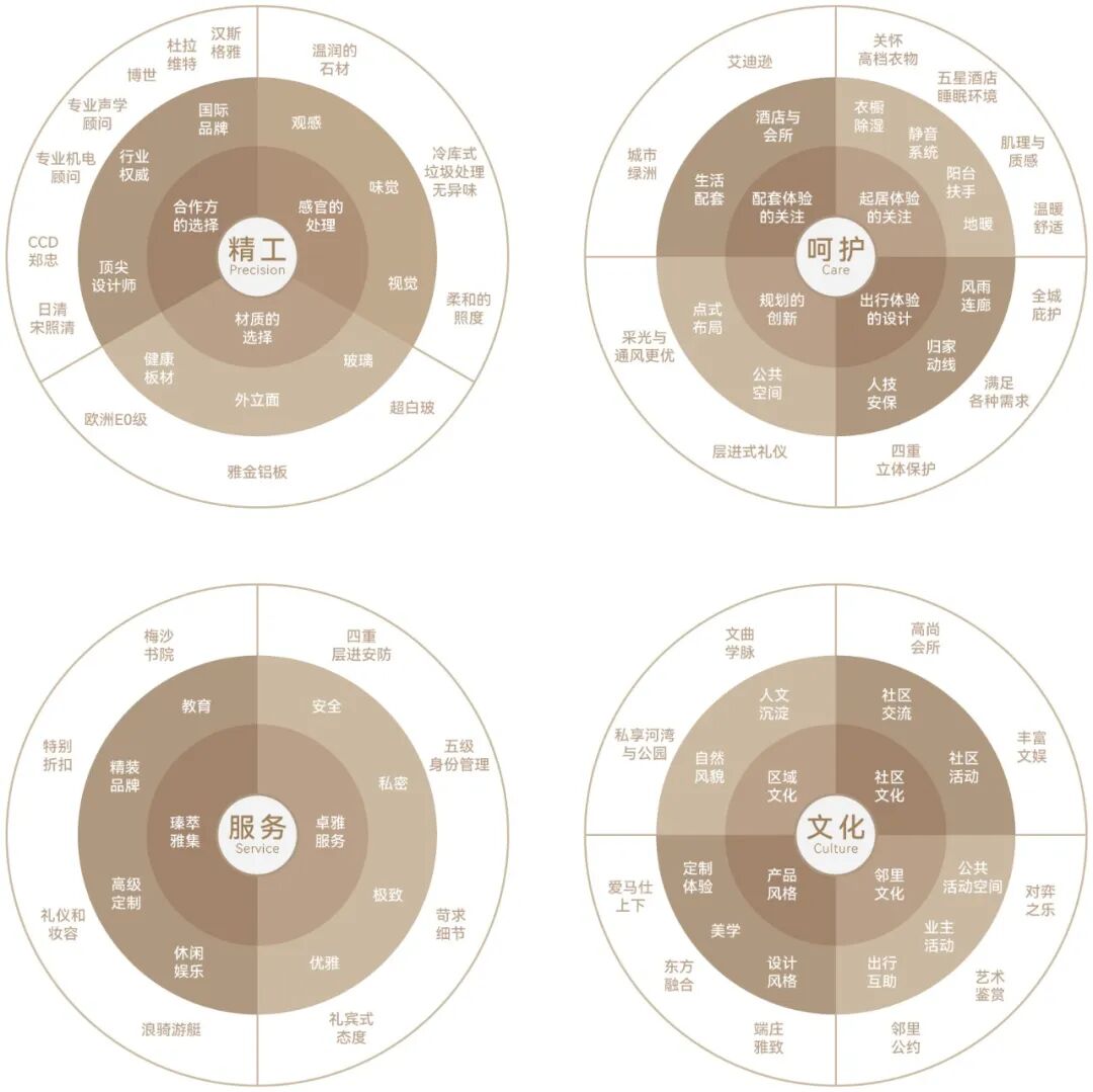 万科「瑧」系从产品打造、情感关怀、文化共融、物业服务四个层面出发,以精工、呵护、文化、服务作为产品开发的四大标准。