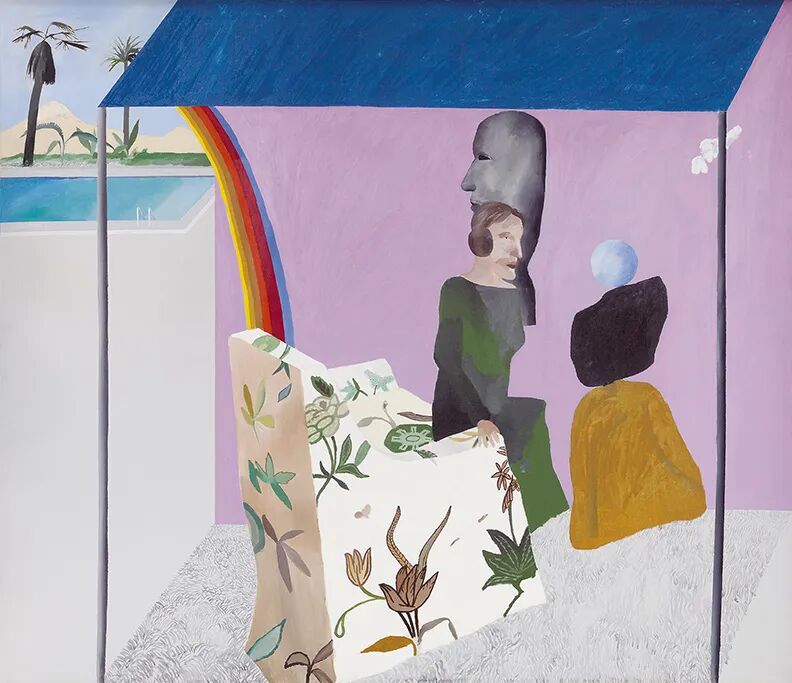 画中,一位穿着时尚的女性坐在自家花园里,旁边是一座古老的雕刻品和威廉·特恩布尔的雕塑。游泳池出现在画面的背景里。一条梦幻般的彩虹向泳池延伸,仿佛许诺要将我们带往天堂。这个画面的灵感来自霍克尼在《洛杉矶时报》上看到的一则游泳池广告。