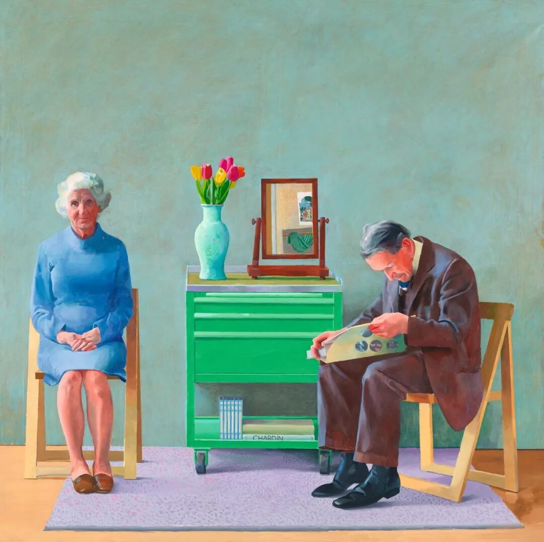 这幅画完成于霍克尼的父亲去世一年前。画面中,他的母亲直接凝视着“镜头”,他的父亲则埋首于书中,好像并没有参与这个家庭时刻:他脚趾瞪着地板,脚后跟向上抬起,好让书本可以平放在膝盖上。